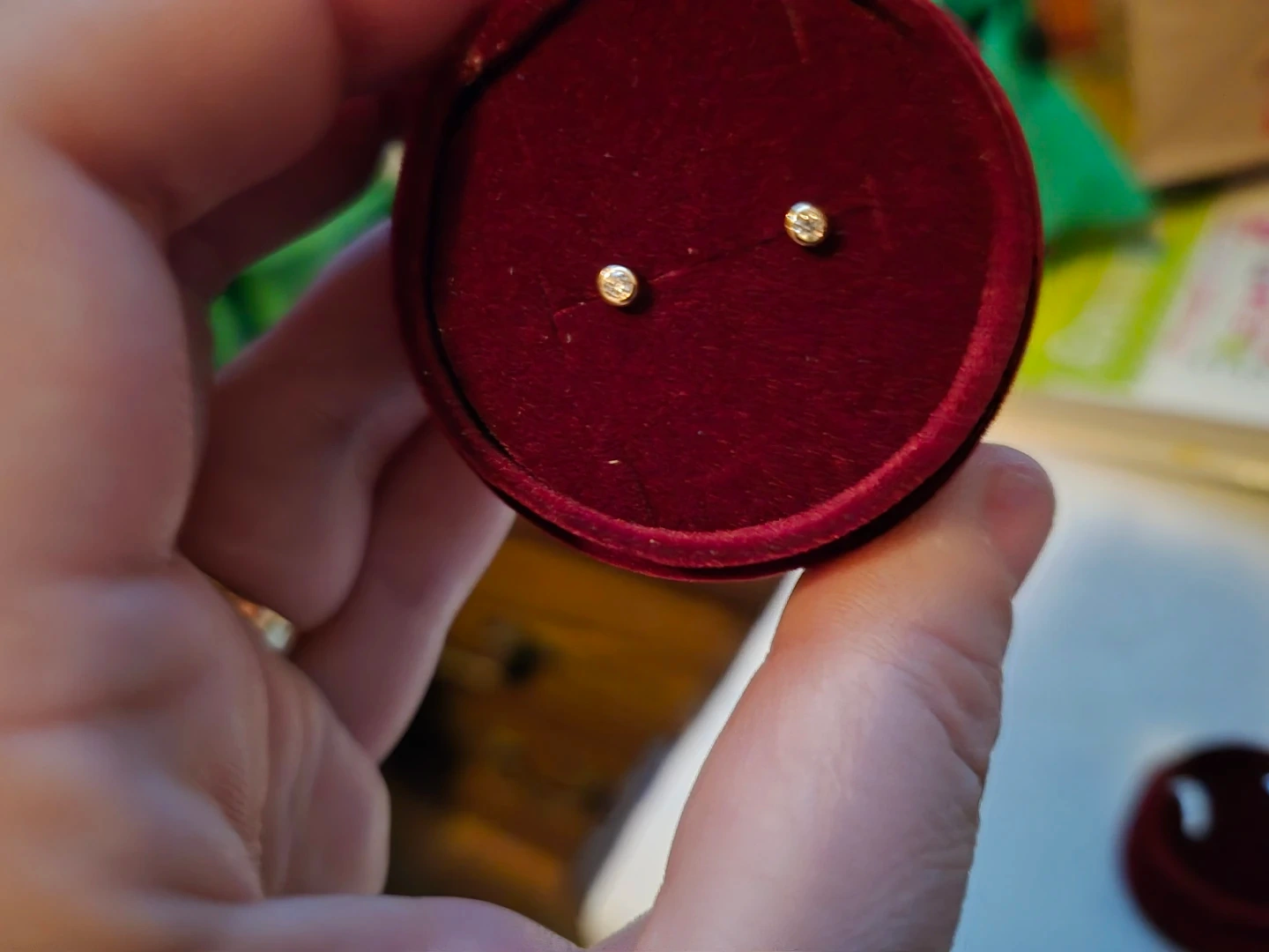 A pair of small, sparkly diamond stud earrings set in gold. They come in a lovely red velvet jewellery box, perfect for gifting or safekeeping. These classic studs add a touch of elegance to any outfit!