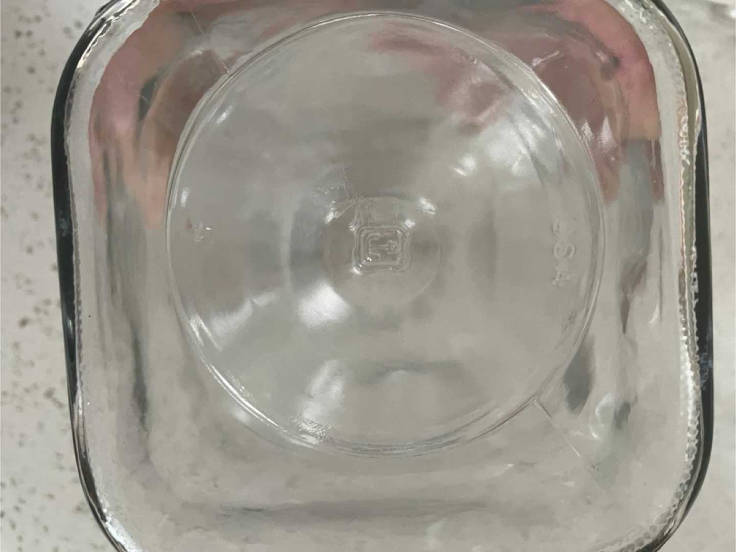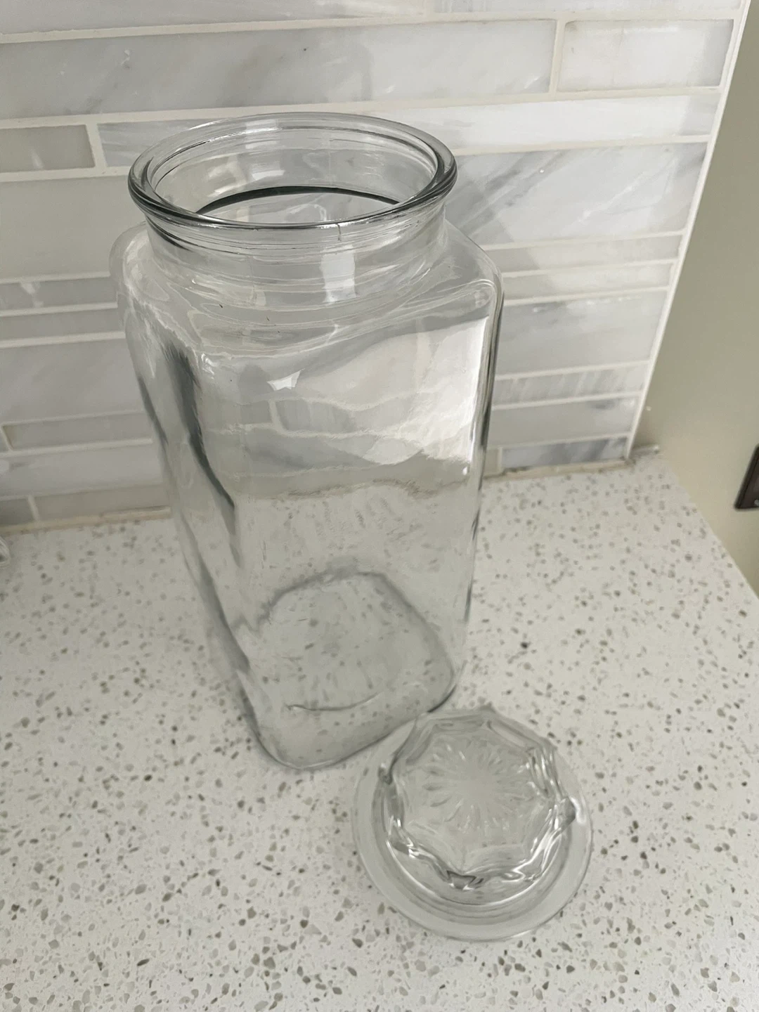Square in shape, perfect for your pantry or bathroom storage. The decorative glass lid has an inner plastic component which give the jar a more airtight seal. Manufactured by Anchor Hocking in USA.