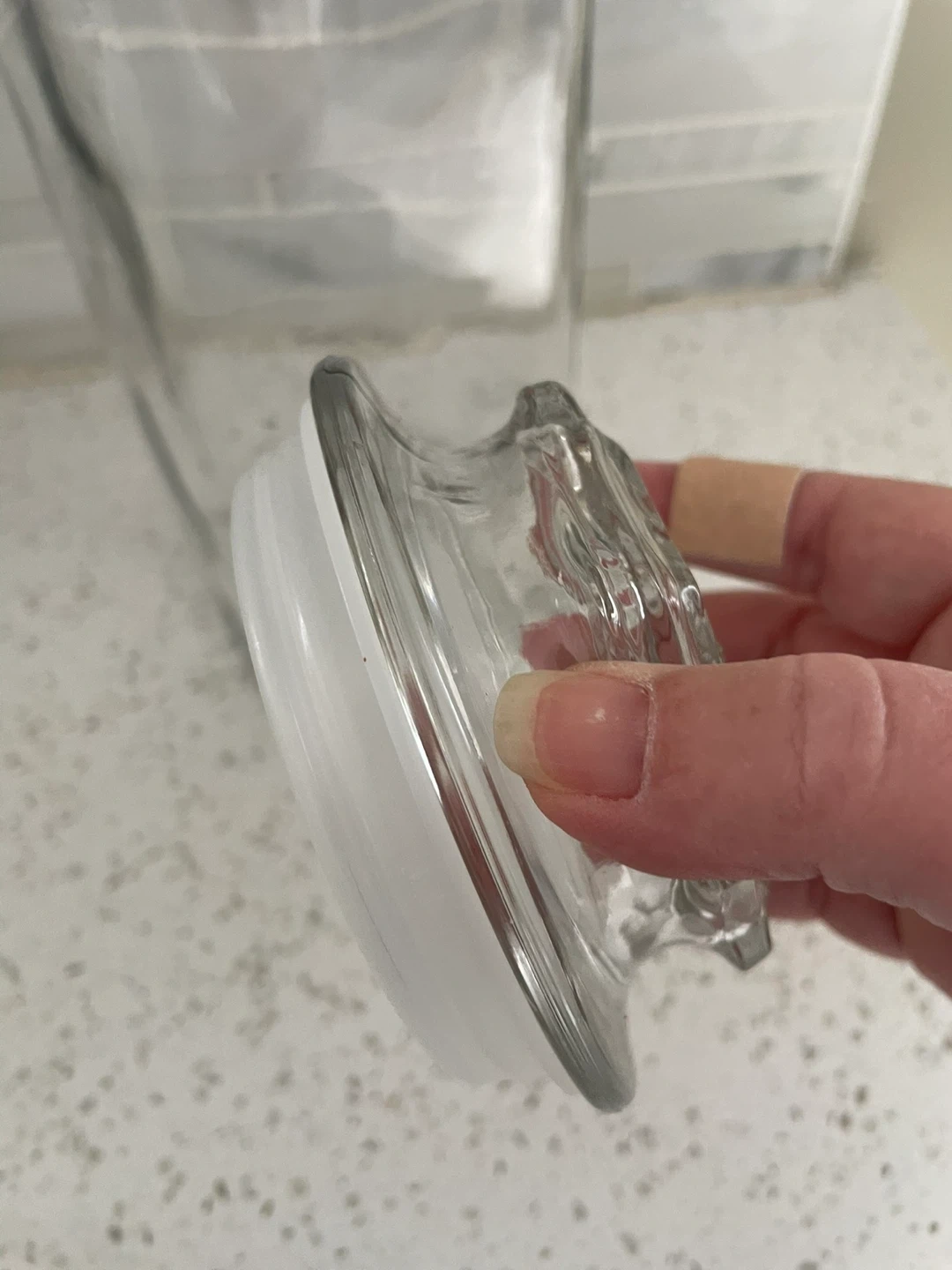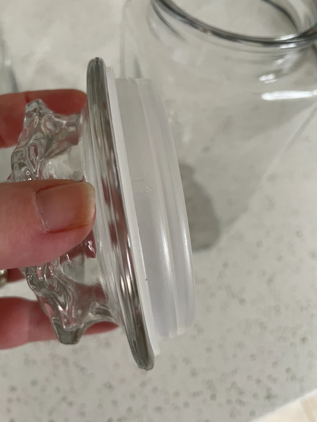 Clear pressed glass storage jar with decorative starburst-style lid. Plastic seals are in excellent condition and some may have never been used.