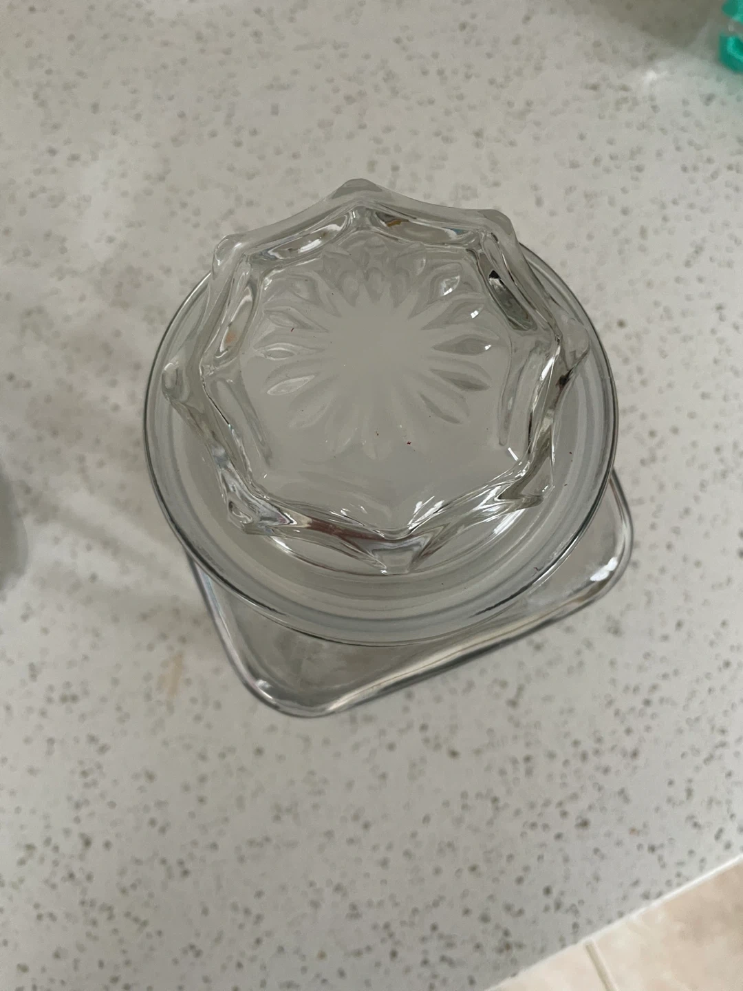 Clear pressed glass storage jar with decorative starburst-style lid. Plastic seals are in excellent condition and some may have never been used.