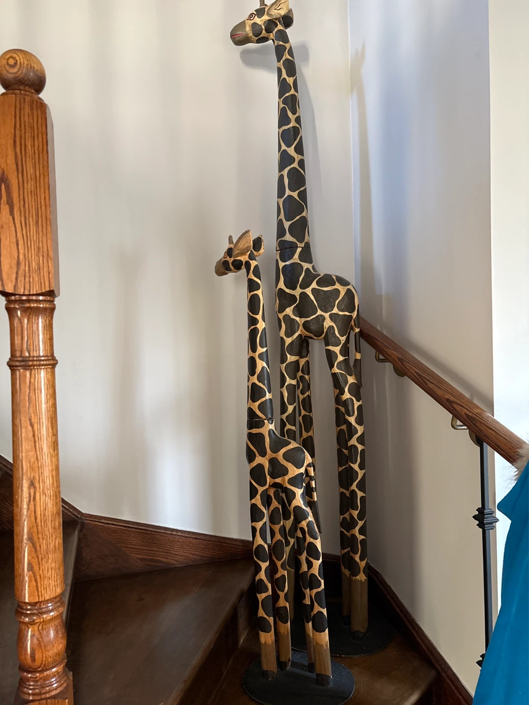A pair of carved wooden giraffe statues with black and tan spotted patterns. These decorative pieces have a distinctive, handcrafted look. They'd make a nice addition to a living room or entryway! 6’ and 4’ tall.