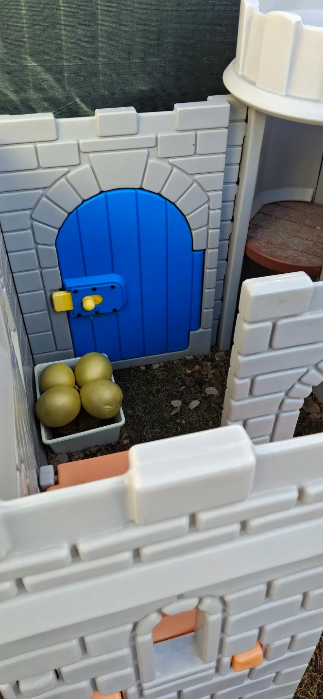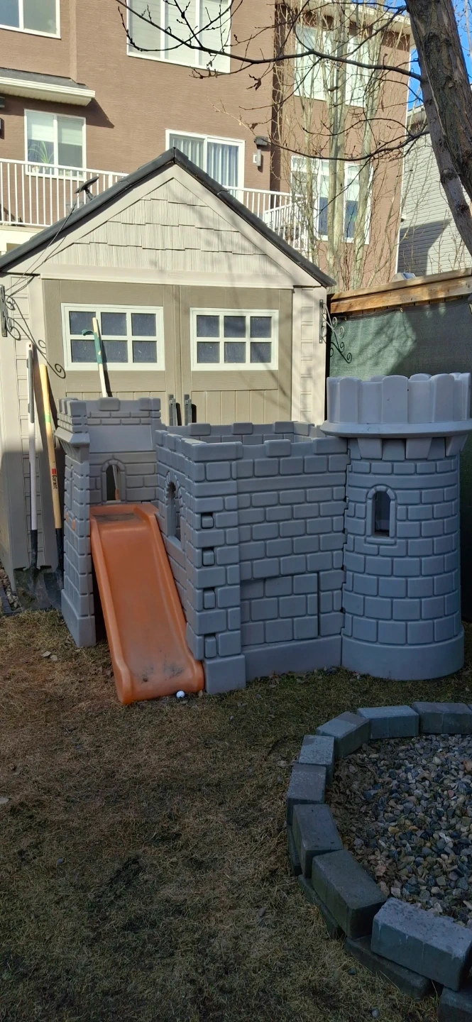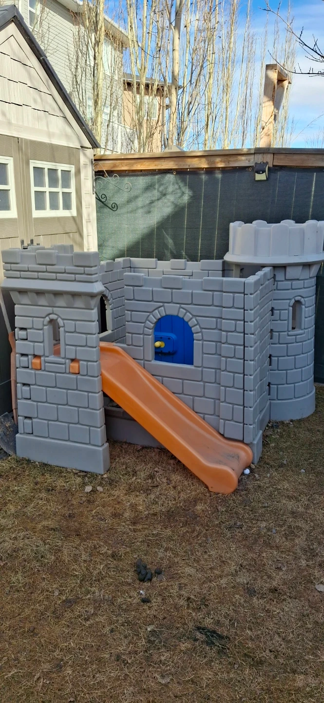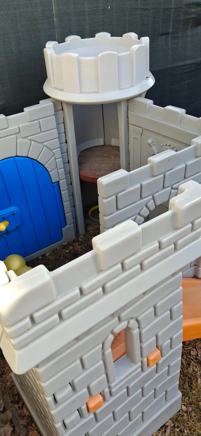 This Little Tikes castle climber is a fun outdoor playhouse for kids. It features a slide, a blue door with working latch, and multiple towers. Made of durable plastic for lasting outdoor fun!