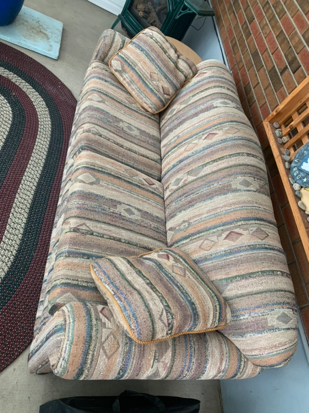 Comfortable two-cushion sofa with a multi-coloured striped and diamond patterned fabric. It comes with two throw pillows matching the sofa's upholstery. The upholstery is a durable fabric blend.