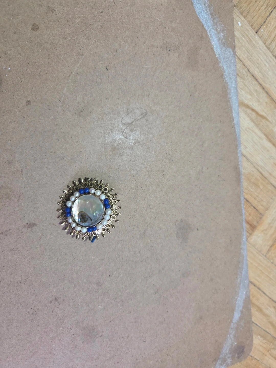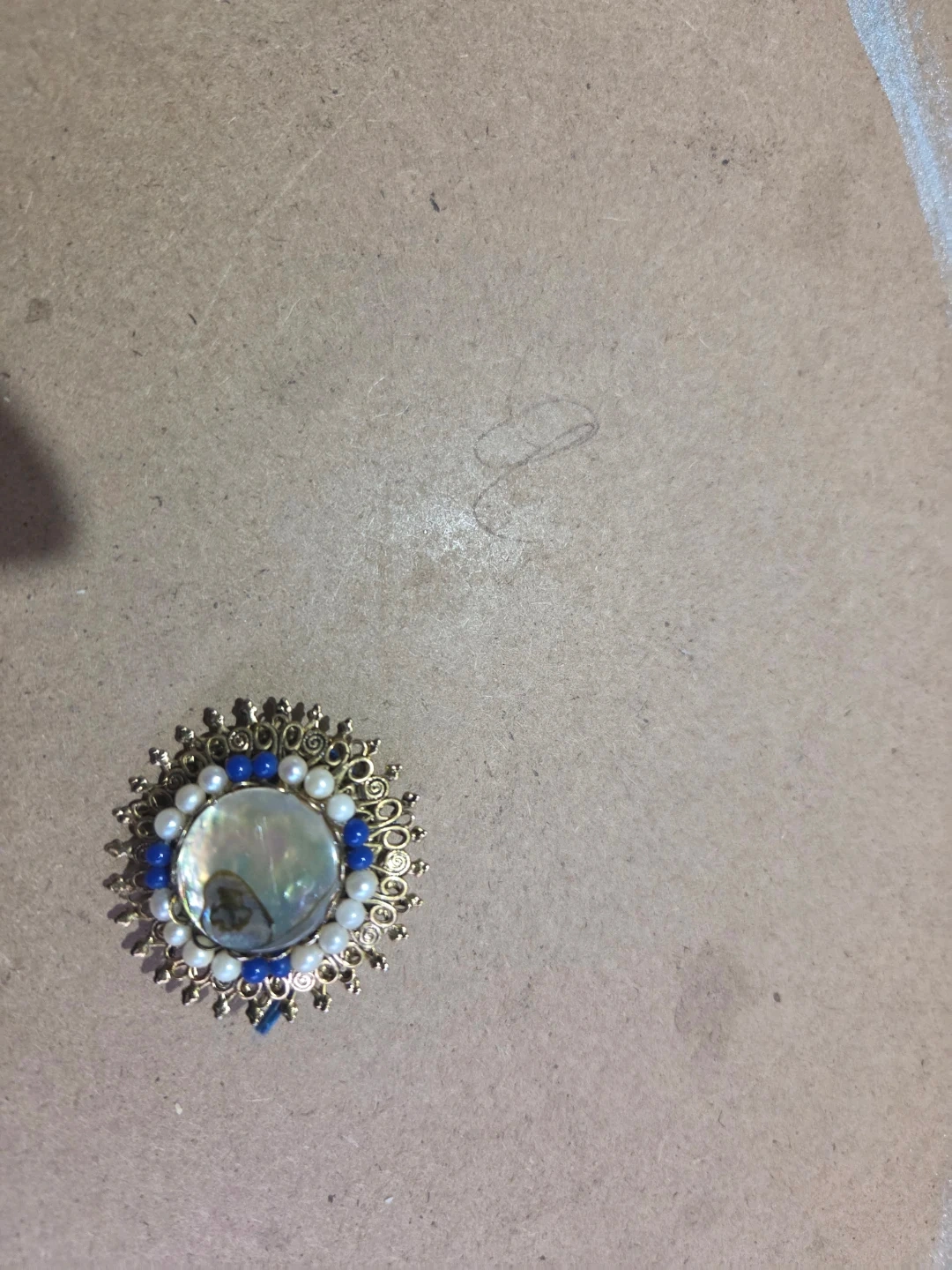 This is a decorative brooch featuring a central mother-of-pearl piece surrounded by white faux pearls and blue beads. It's crafted with gold-tone metal detailing.