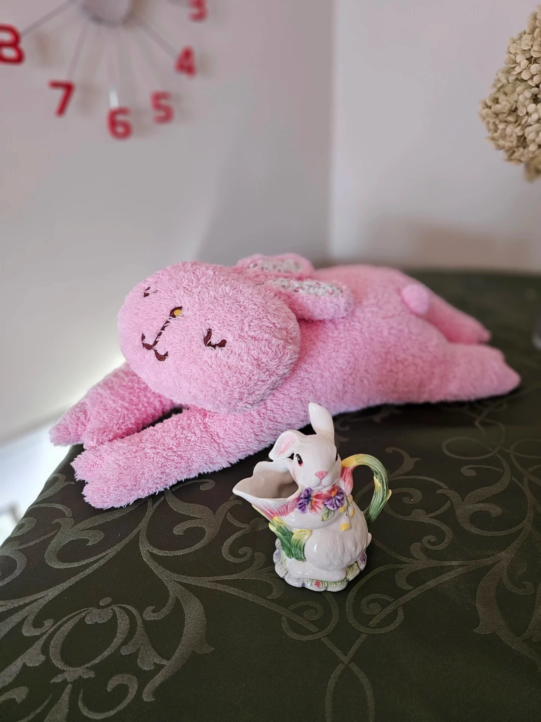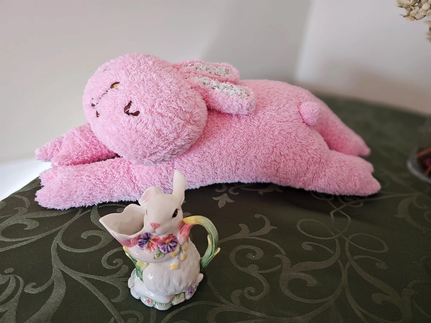 A cute pink plush bunny and a charming ceramic bunny creamer. The creamer is white with colourful floral accents and a handle shaped like a green stem. Perfect for Easter or spring decor!