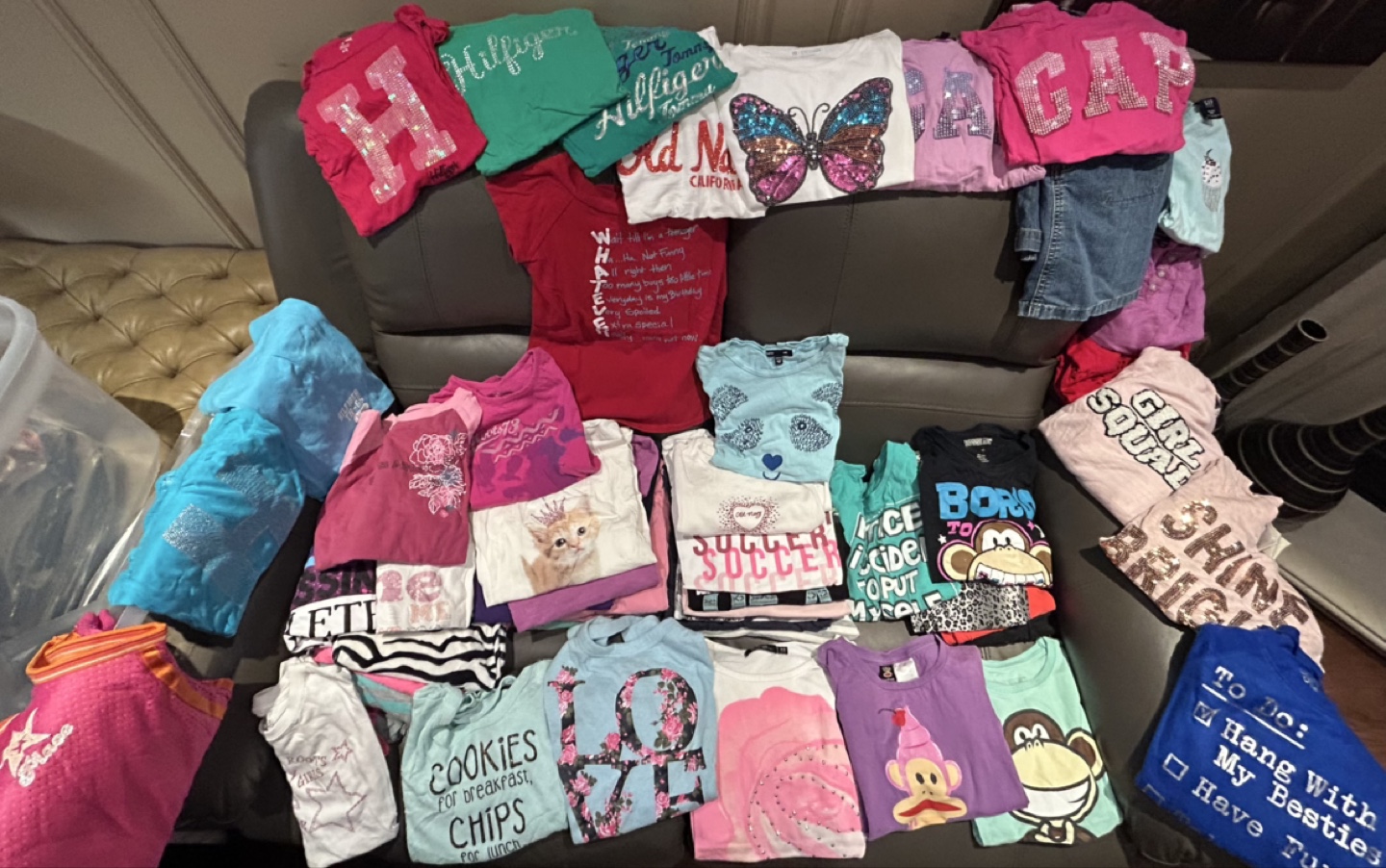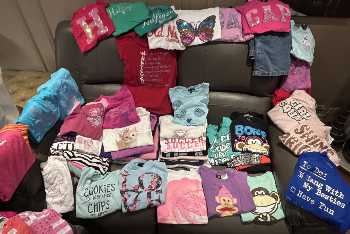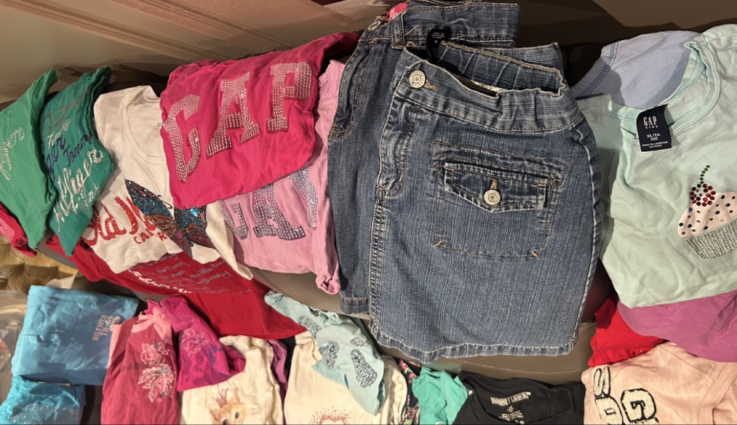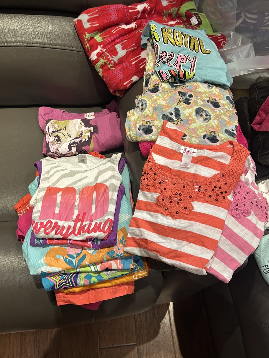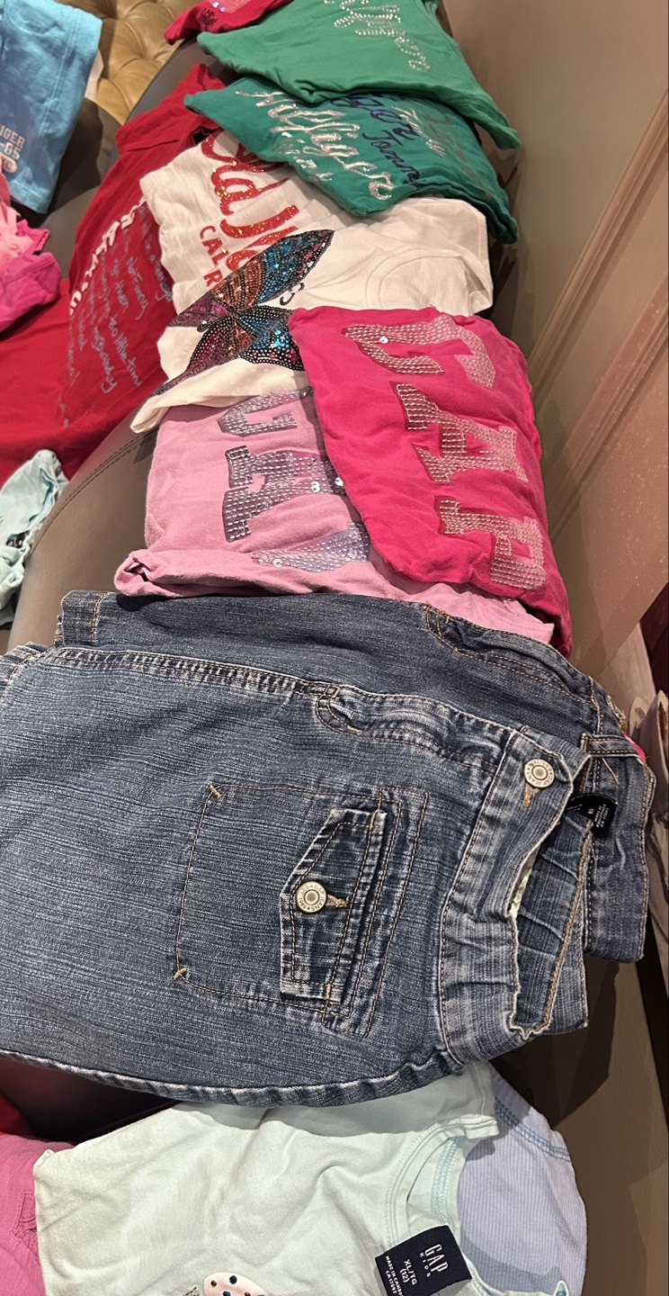A collection of girl’s tops from T-shirts and graphic t-shirts, tank tops and long-sleeved tops, sweaters and some leggings, a few pjs, swimwear cover up, 2 Gap Denim jean skirts(10)1 cotton skirt