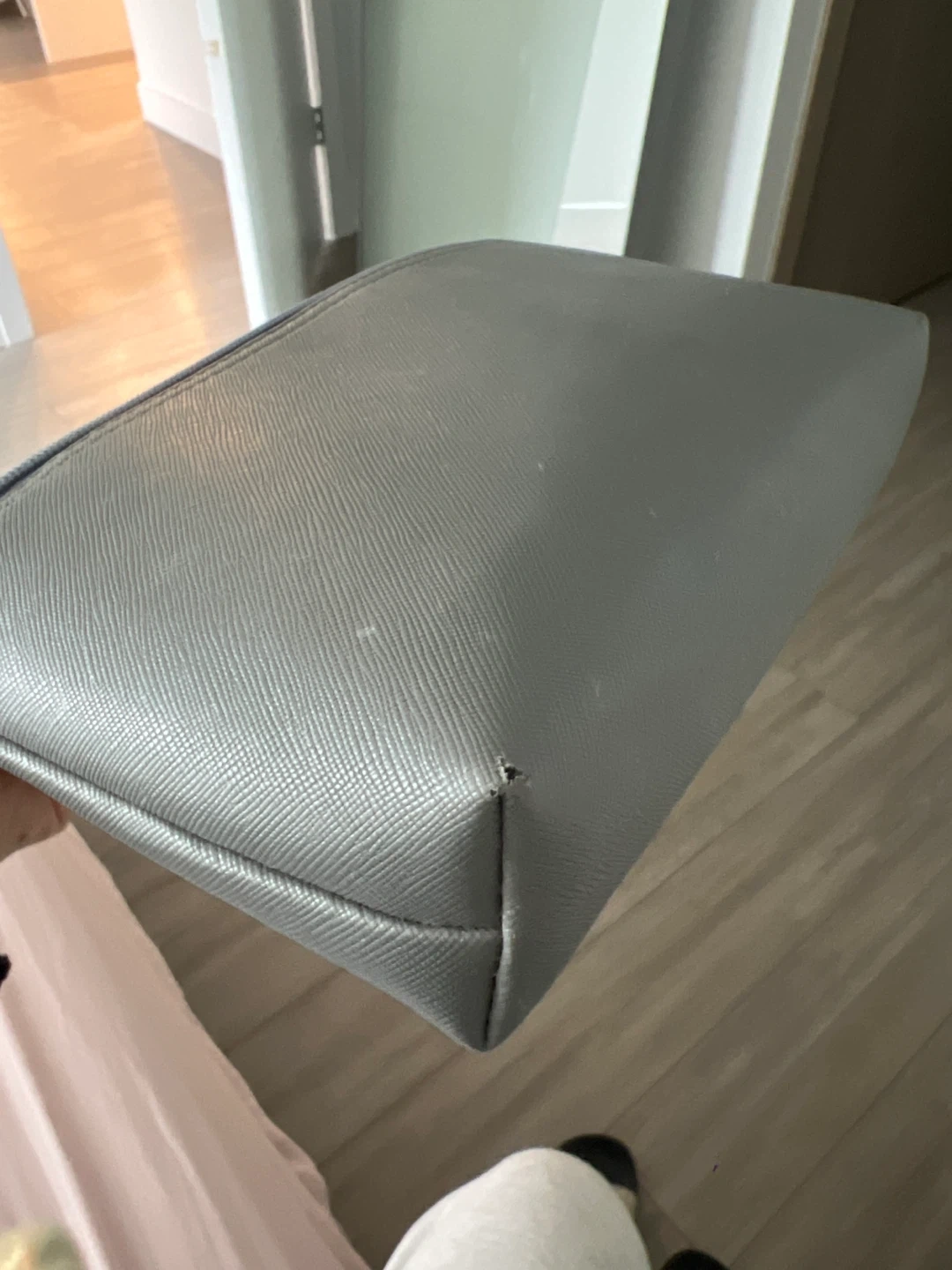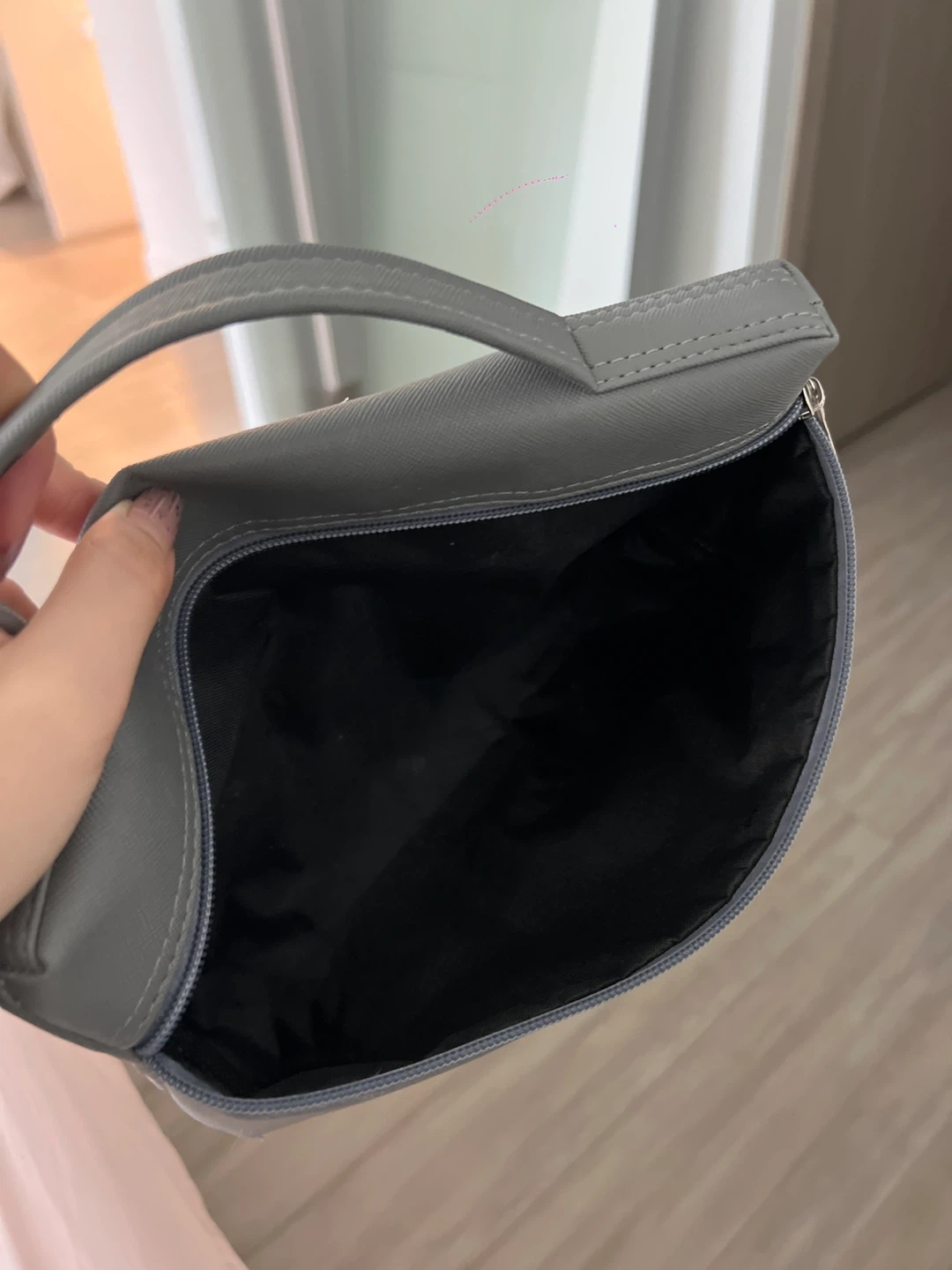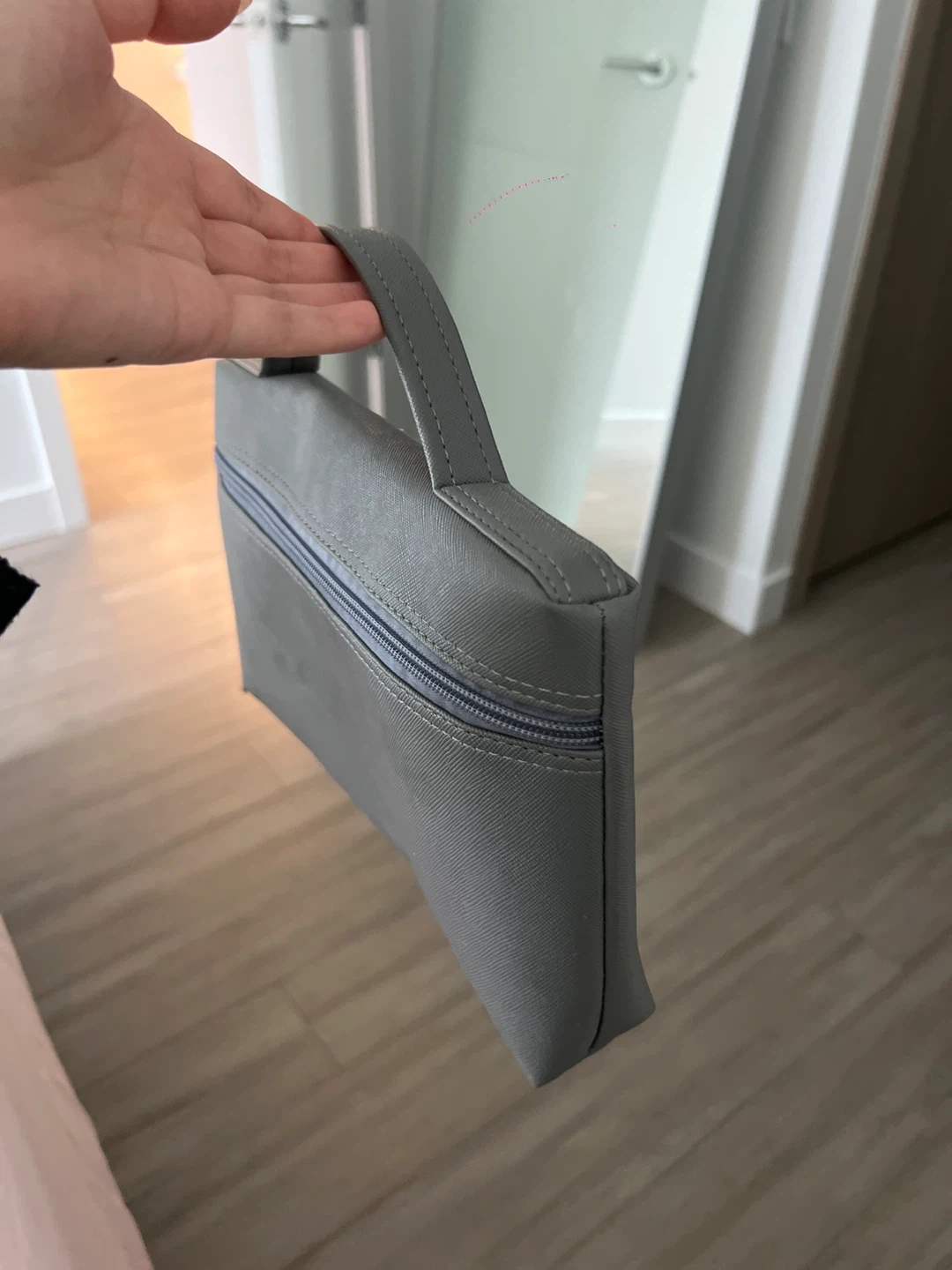 Grey makeup bag with a zippered closure. It's made of faux leather material and includes a top handle for easy carrying. The interior is lined with black fabric.
