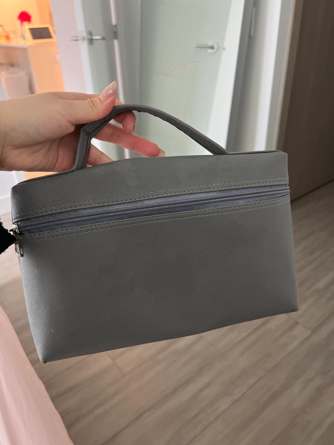 Grey makeup bag with a zippered closure. It's made of faux leather material and includes a top handle for easy carrying. The interior is lined with black fabric.