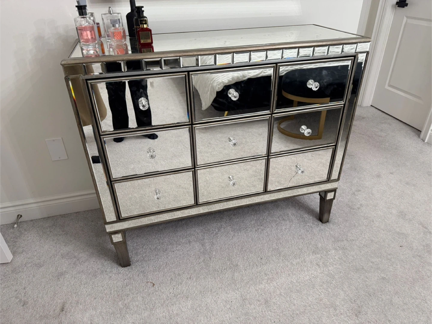 This mirrored dresser features a striking design with nine crystal-like drawer pulls. It's mirrored on all sides, adding a touch of glam to any room. The dresser offers ample storage with its multiple drawers.