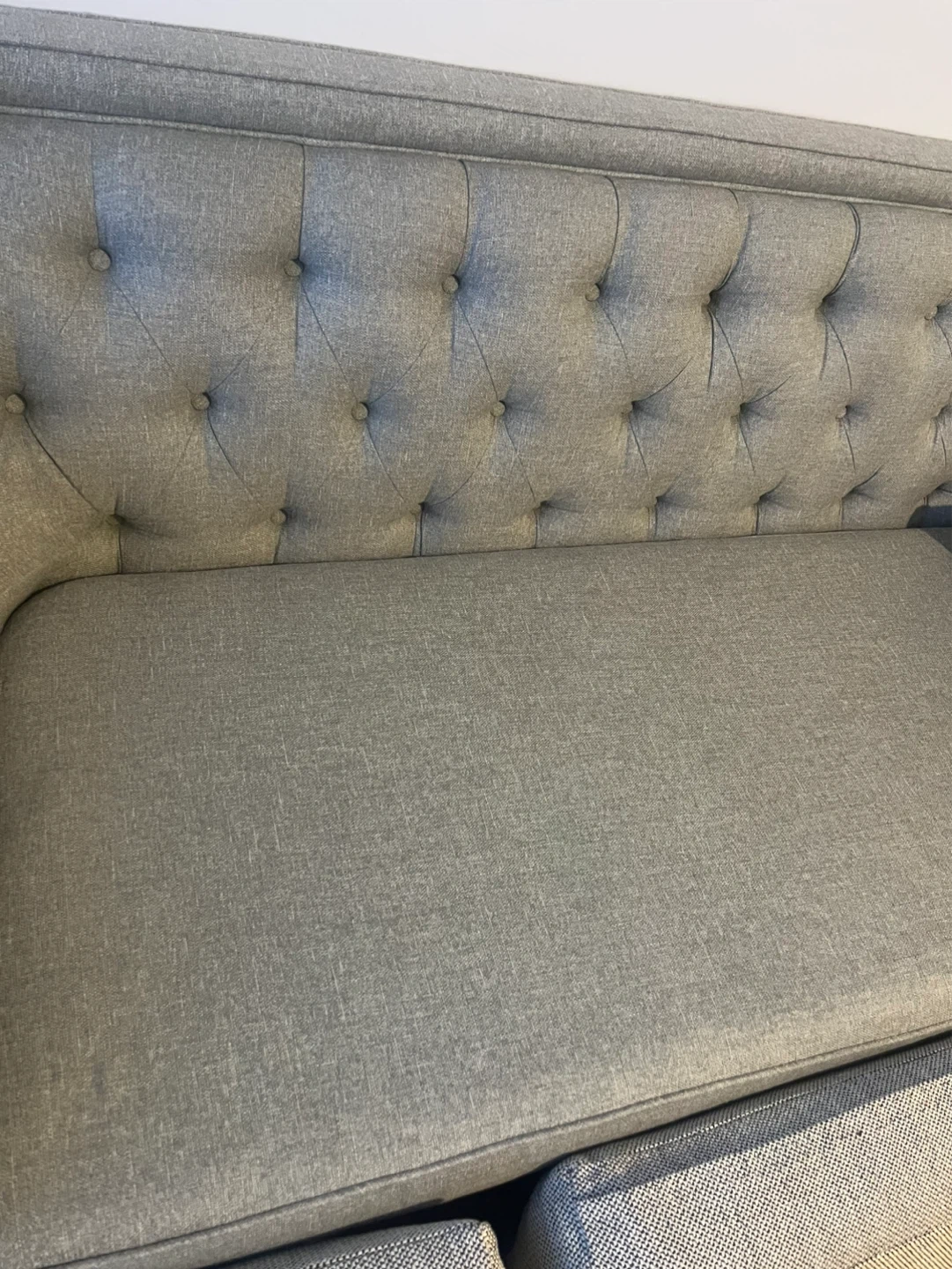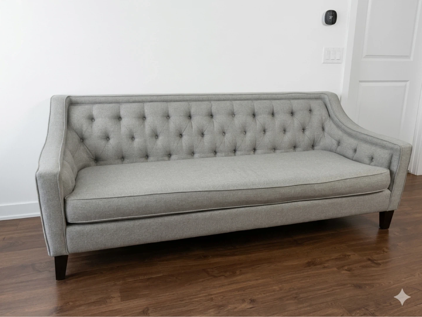 Selling this stylish light grey sofa from Structube. It has a beautiful button-tufted back and a mid-century modern silhouette that fits perfectly in any living room or condo.