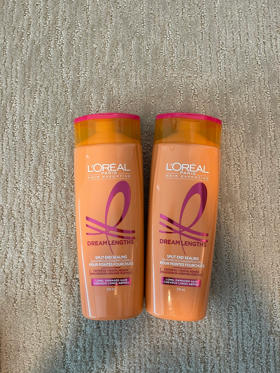 Two bottles of L'Oréal Paris Dream Lengths Split End Sealing Shampoo. This shampoo is formulated for long, damaged hair. It contains Castor Oil and Vegetal Keratin to help seal split ends. Each bottle is 591 mL.