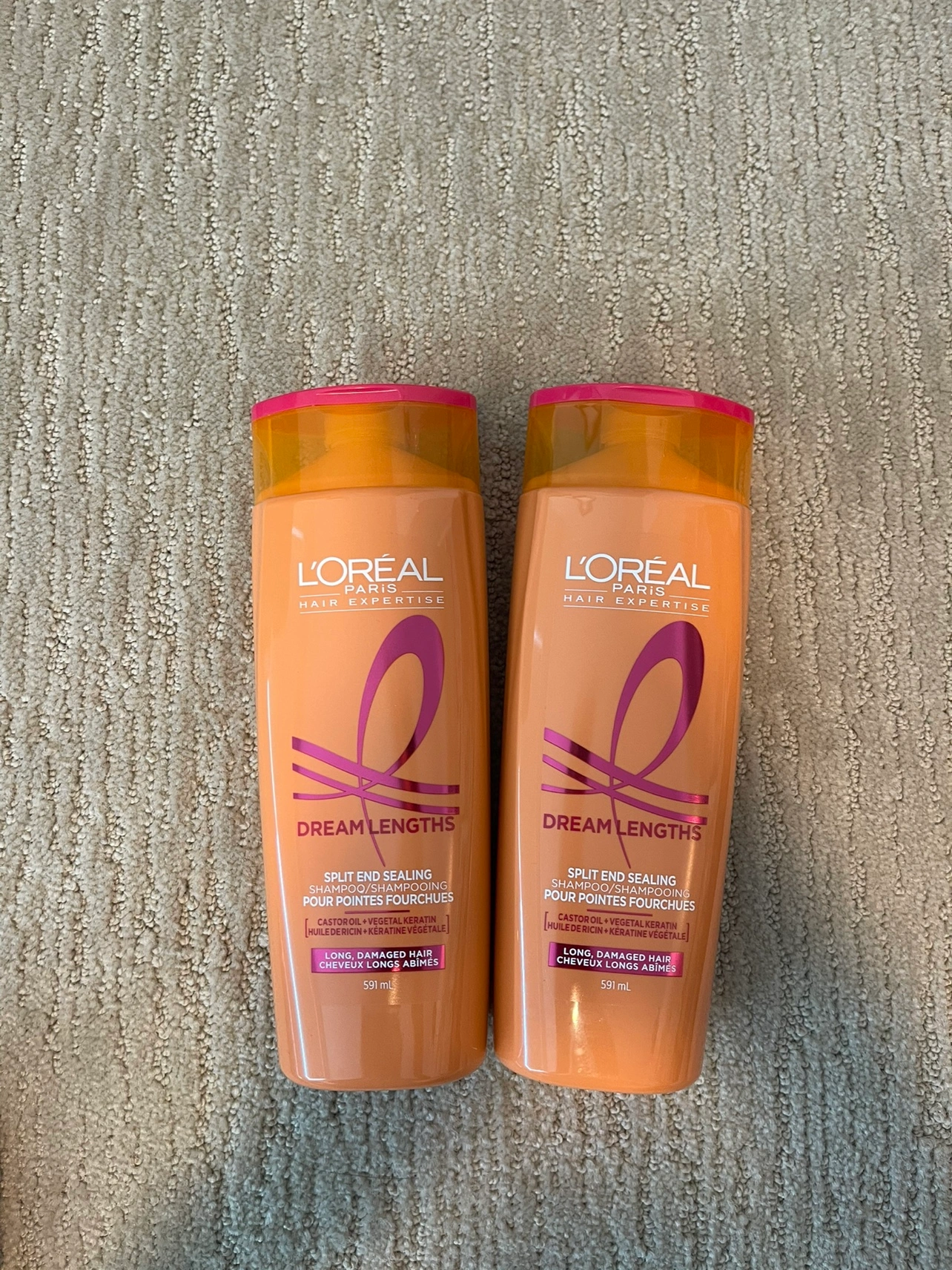Two bottles of L'Oréal Paris Dream Lengths Split End Sealing Shampoo. This shampoo is formulated for long, damaged hair. It contains Castor Oil and Vegetal Keratin to help seal split ends. Each bottle is 591 mL.