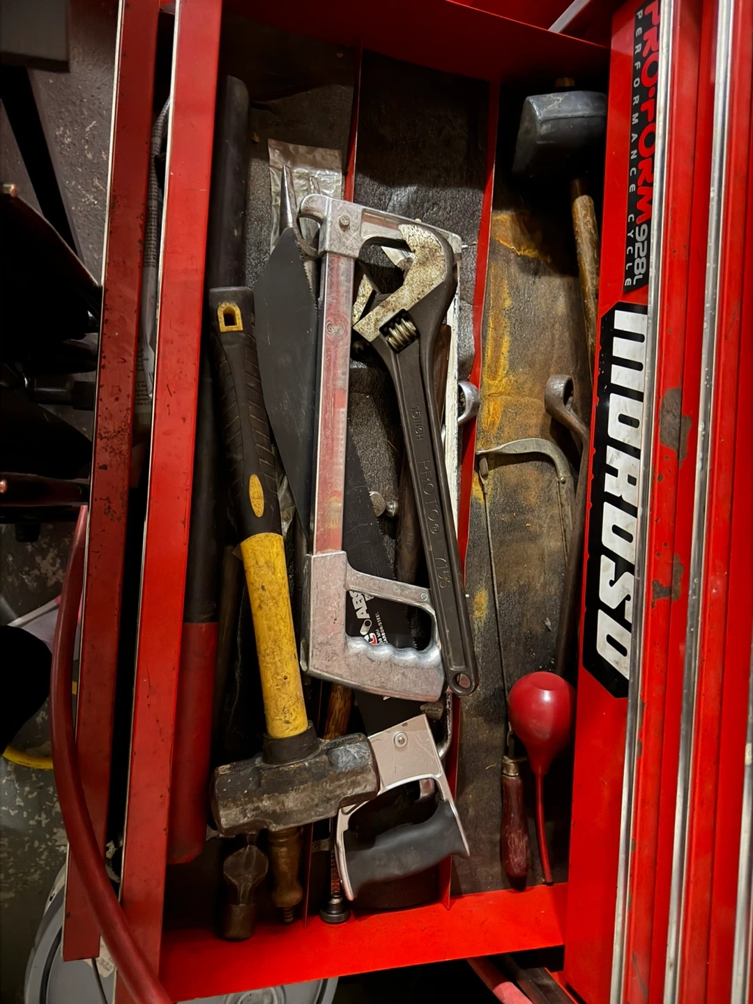 A collection of various tools including wrenches, pliers, a ratchet, and a saw. Many of these tools are made of metal for durability. This assortment is great for a home garage or workshop. Would like to see everything all together