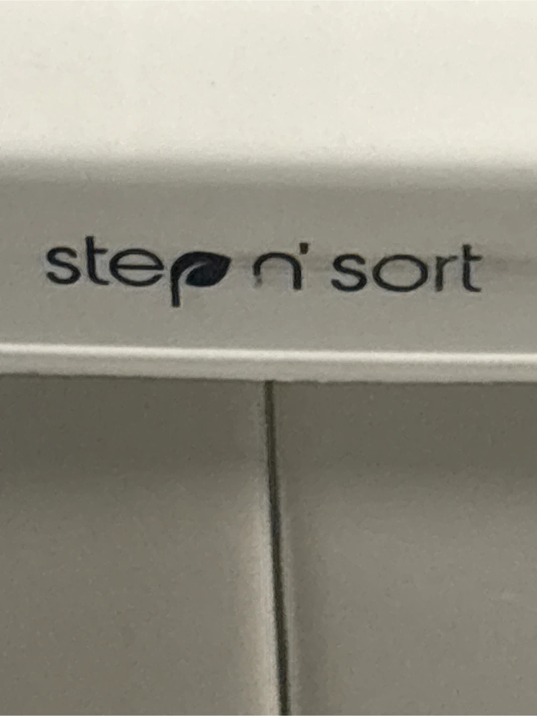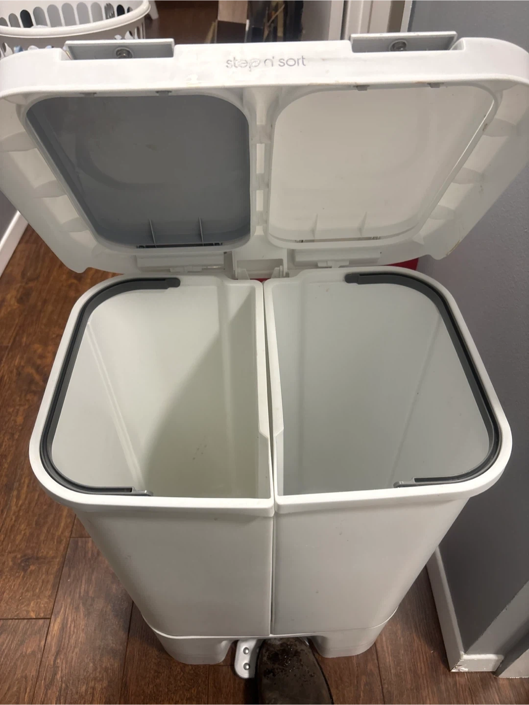 This is a white dual compartment step can by Step 'n Sort. It features two separate bins for sorting waste. Both lids open with a foot pedal for hands-free operation.