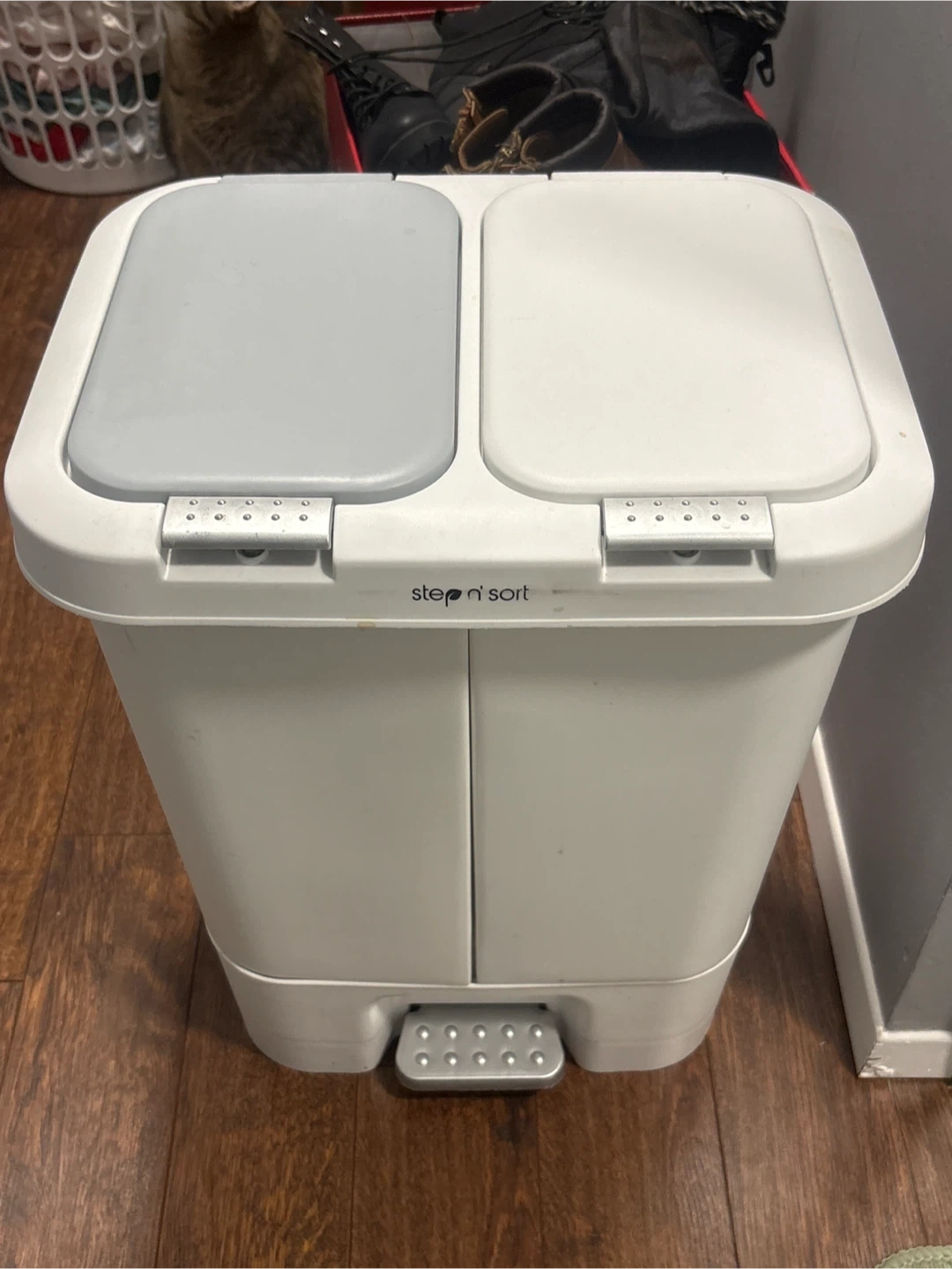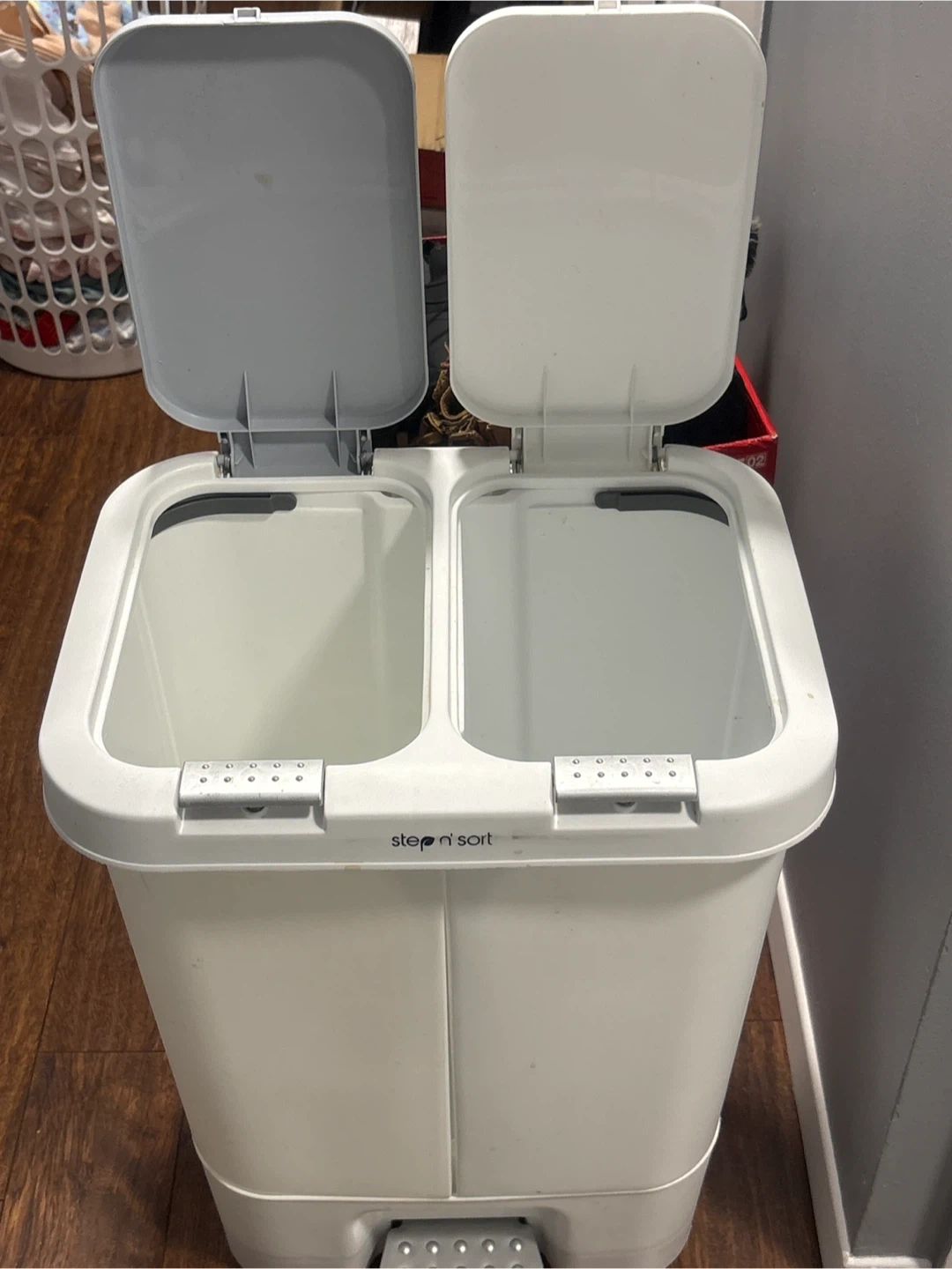 This is a white dual compartment step can by Step 'n Sort. It features two separate bins for sorting waste. Both lids open with a foot pedal for hands-free operation.