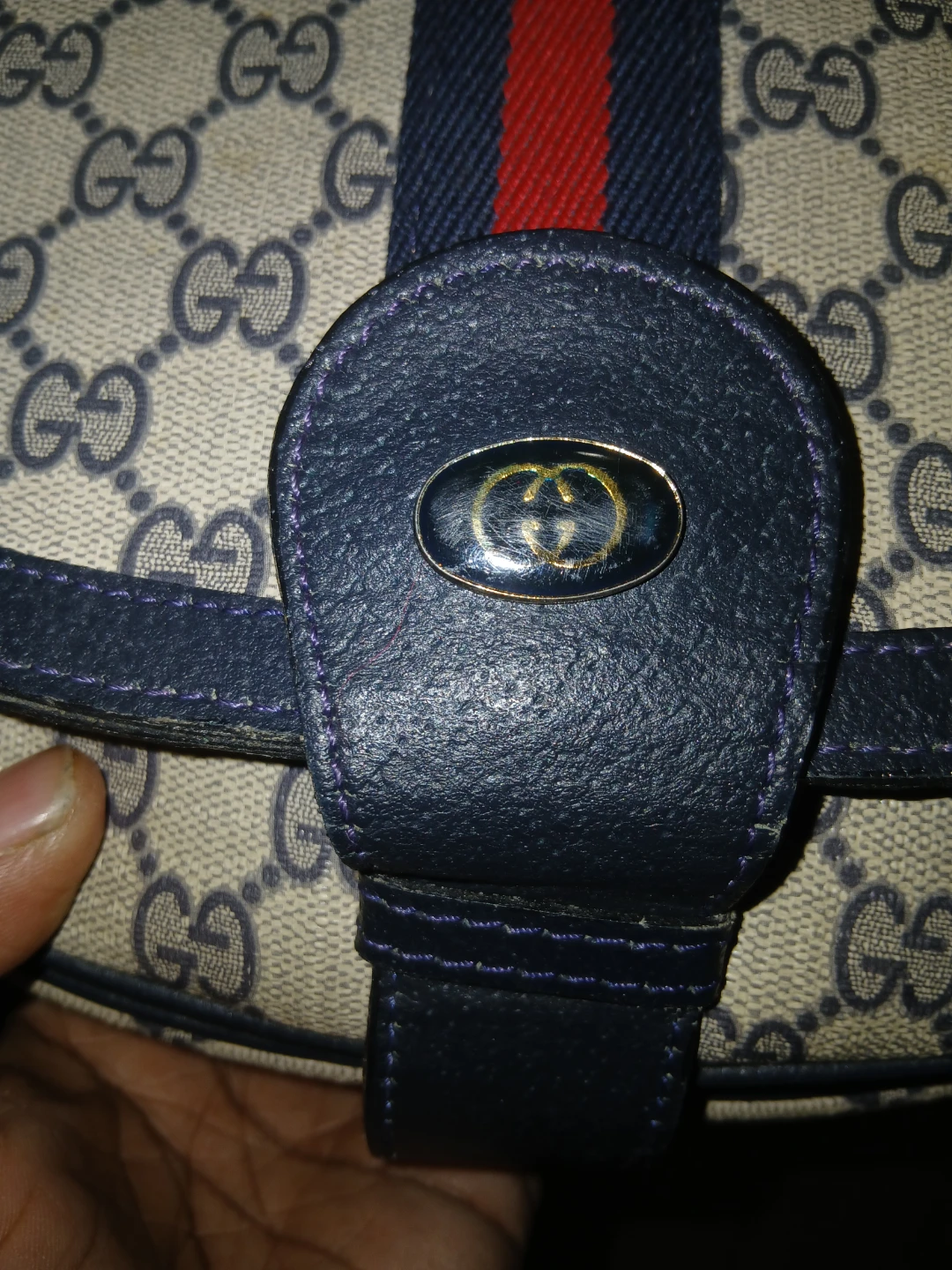 A stylish vintage Gucci crossbody bag featuring the iconic GG canvas pattern and a navy and red stripe detail. It's a classic piece that adds a touch of luxury to any outfit