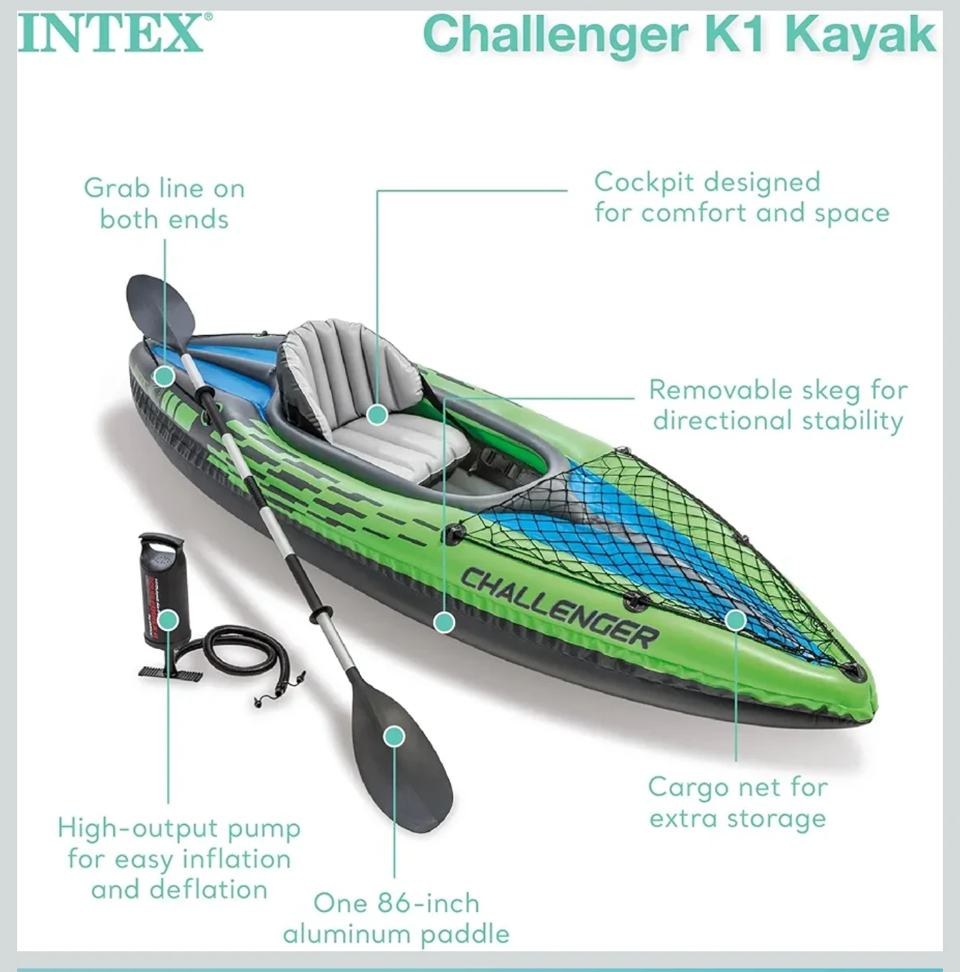 I have two Intex Challenger k1 kayaks they come with high performance output pump, a 86-in aluminum paddle and they are designed for comfort. They have space for with a removable skag for stability and a cargo net for extra storage. There is also grab lines on both ends for easy handling. Prices negotiable