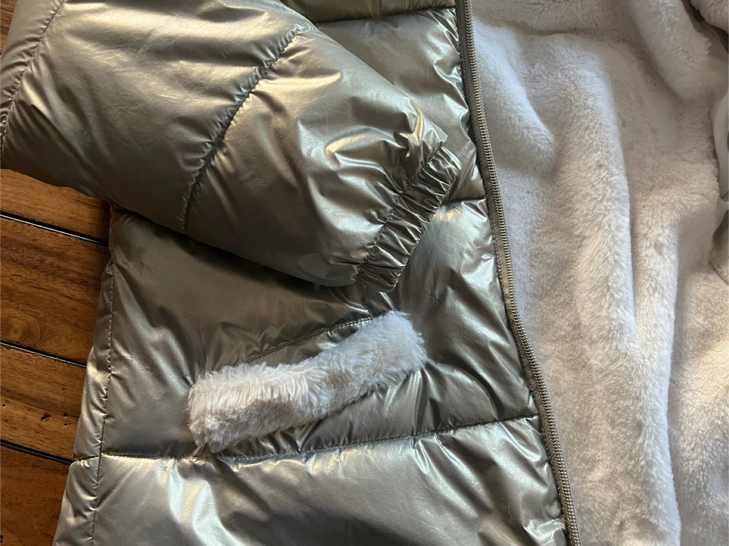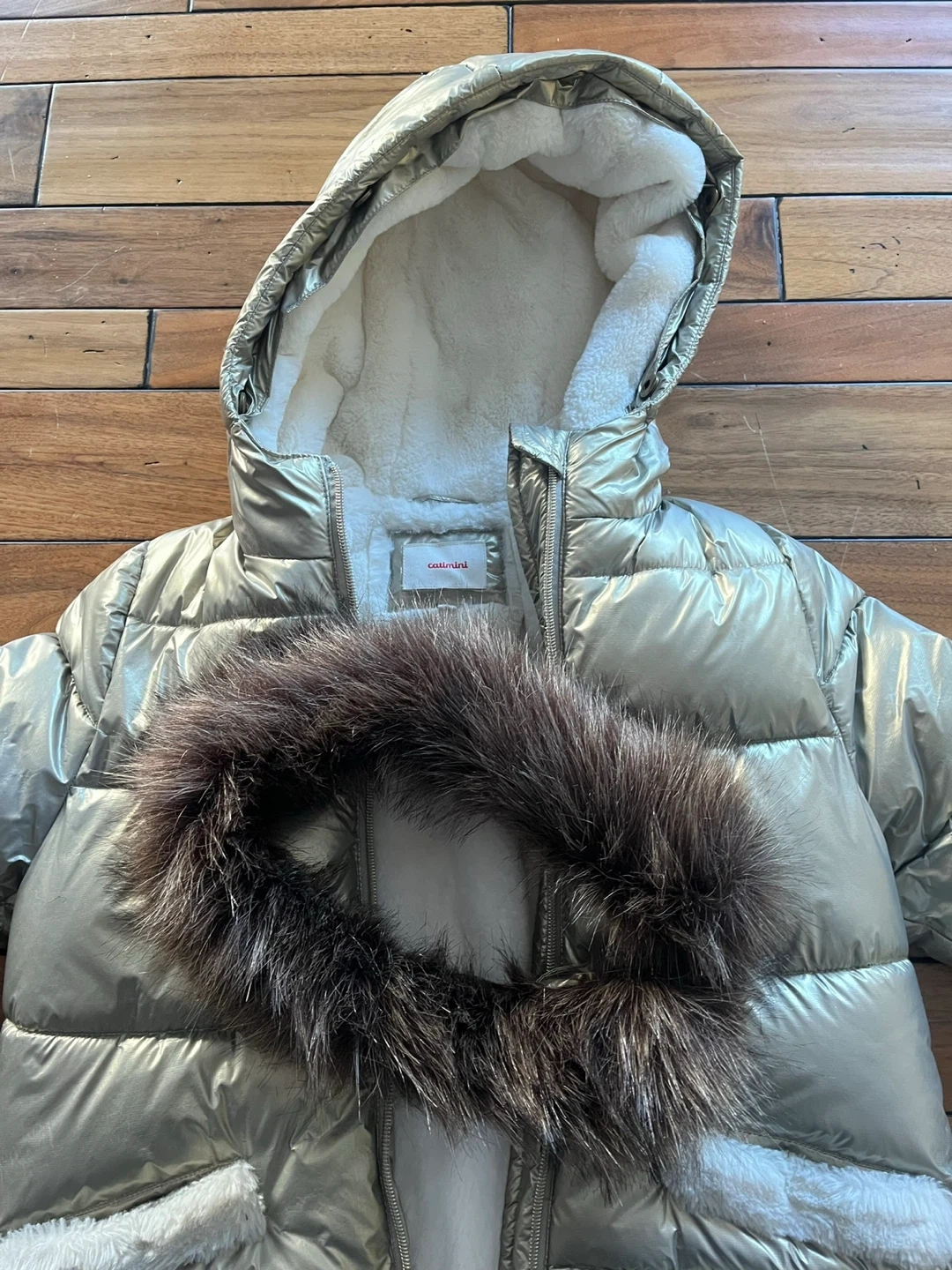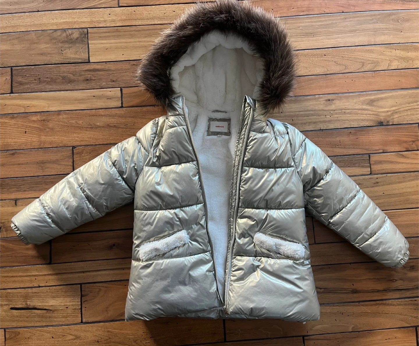 This is a warm Catimini puffer jacket. (famous in Europe-bought in Paris) It features a cozy faux fur lining and a detachable fur trim on the hood. The exterior is a metallic silver, and it's designed for cold weather. It's a size 10.