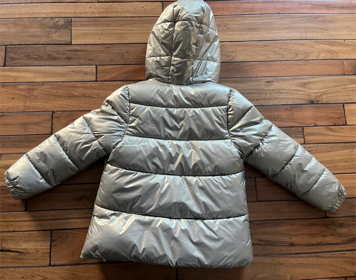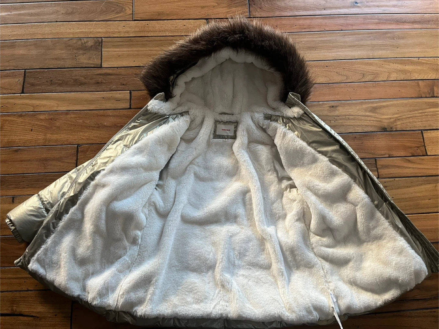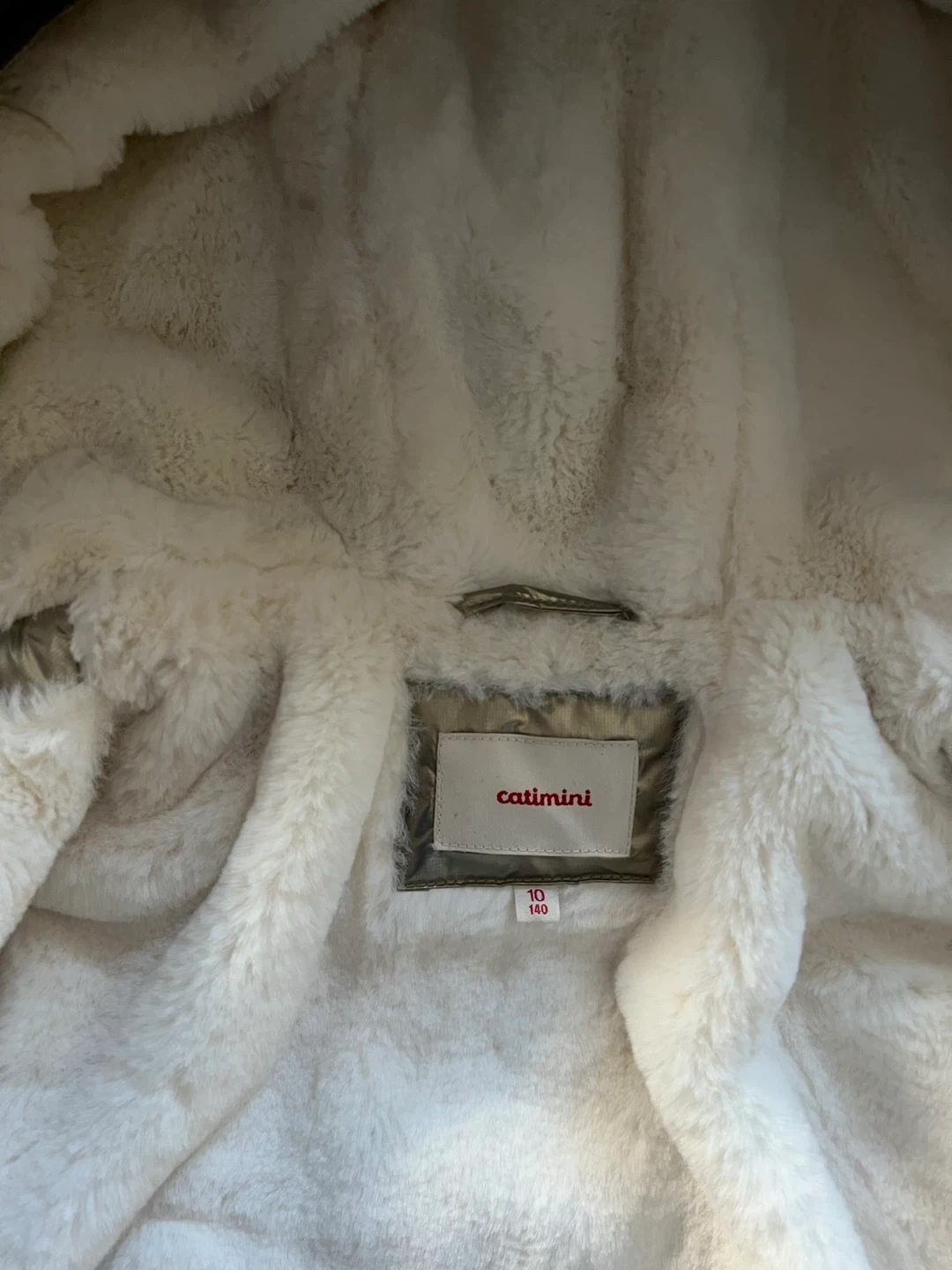 This is a warm Catimini puffer jacket. (famous in Europe-bought in Paris) It features a cozy faux fur lining and a detachable fur trim on the hood. The exterior is a metallic silver, and it's designed for cold weather. It's a size 10.