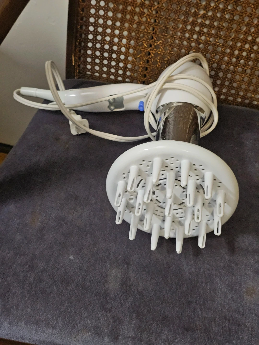 White Conair hair dryer with a large diffuser attachment included. It has a cool shot button and multiple heat settings for versatile styling. A great tool for creating volume and definition for curly or wavy hair!