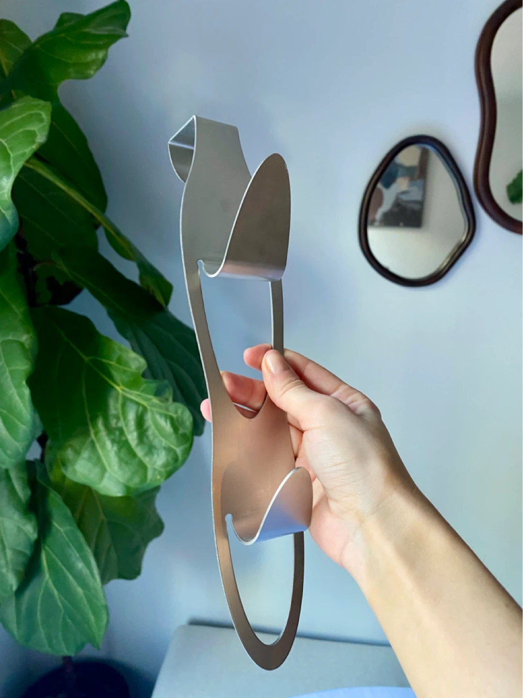 This discontinued Umbra hook rack is made of brushed metal. It's designed to hang over a door for extra storage. Useful for keeping frequently used items accessible! Designer is William Harvey (as stated on back of hook).