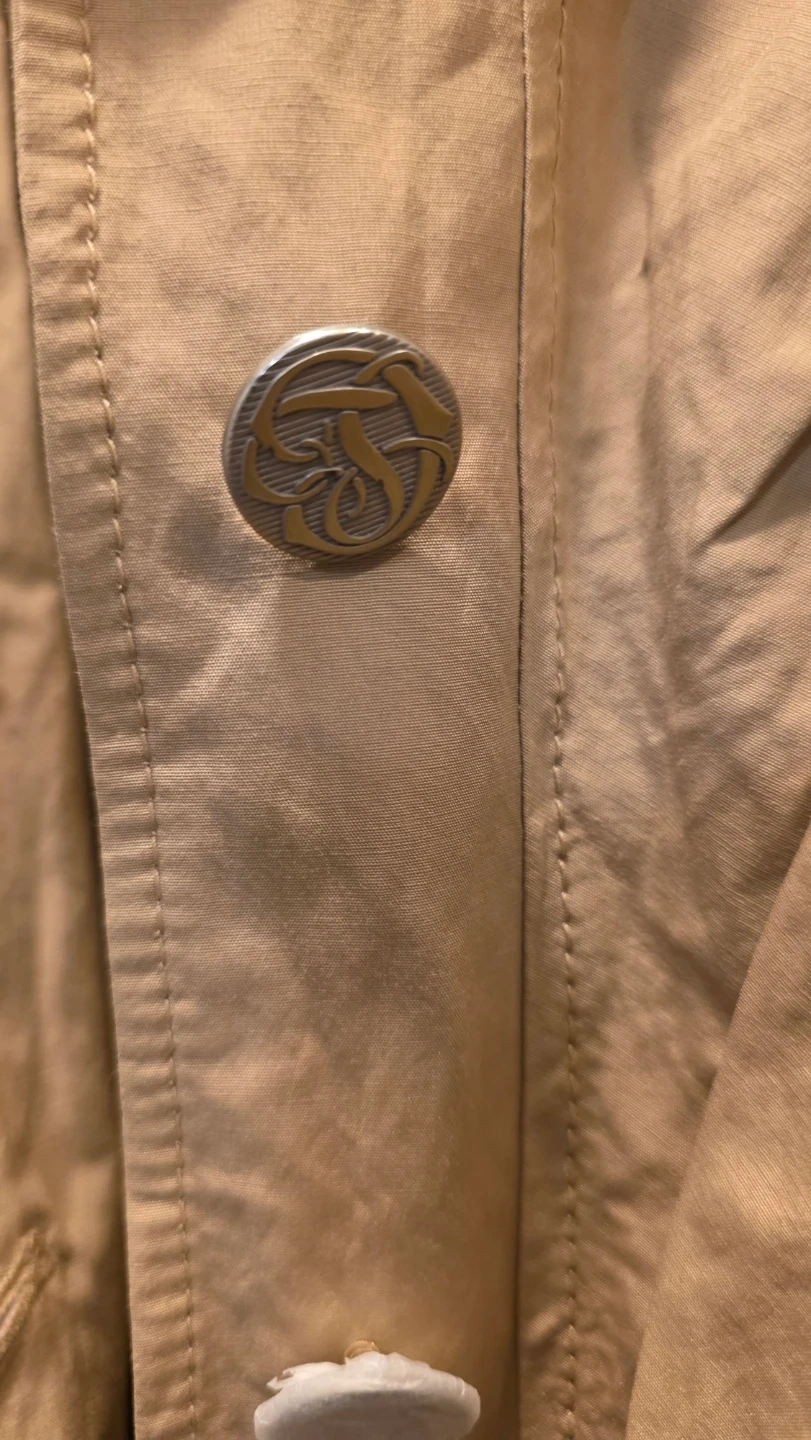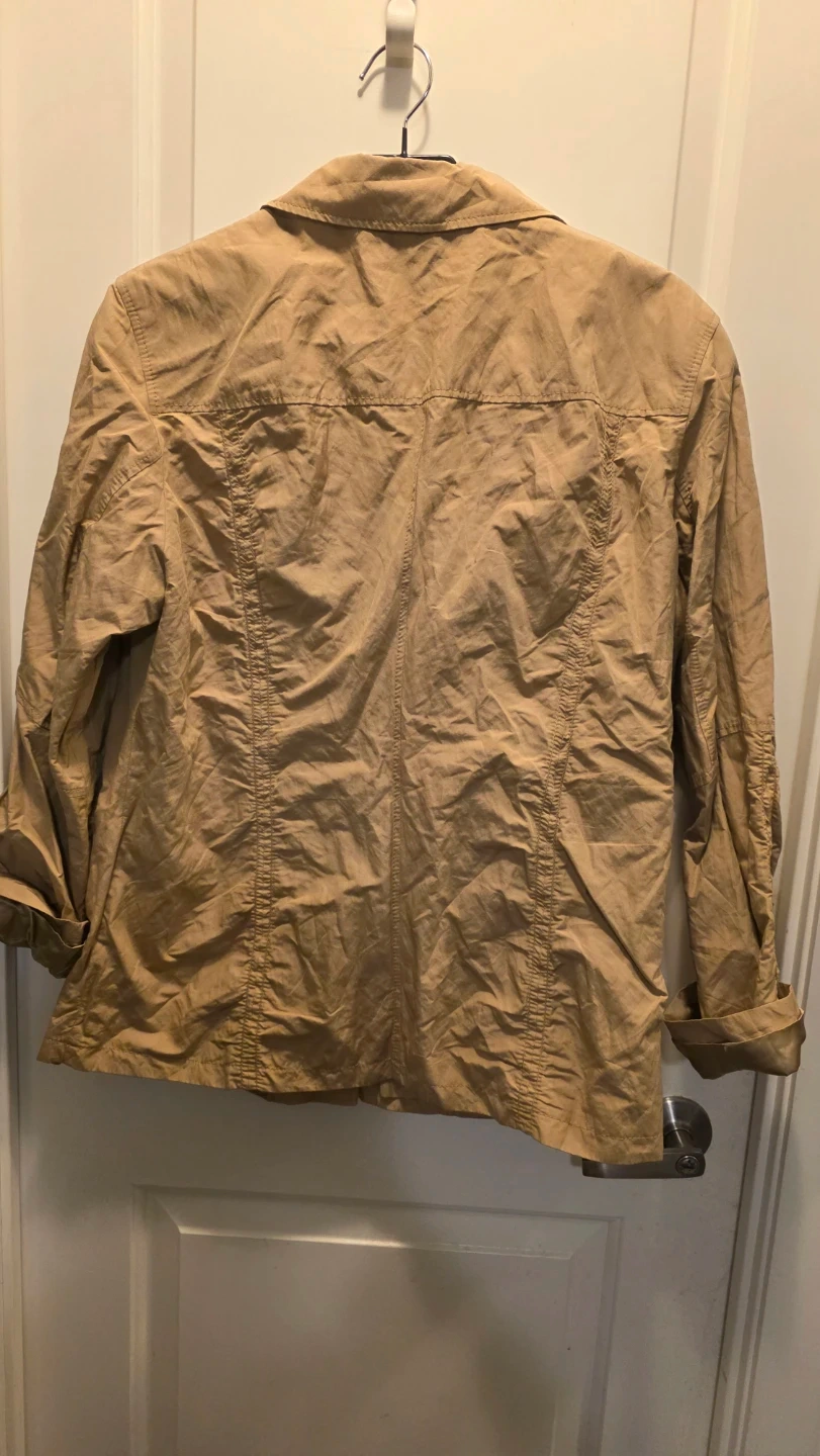 This tan jacket features a classic button-up style with multiple pockets. It's a size 44 and made from a lightweight fabric. Great for layering!
