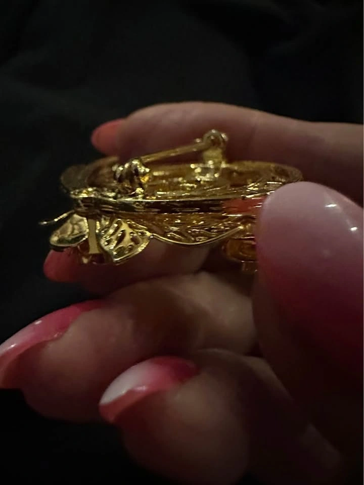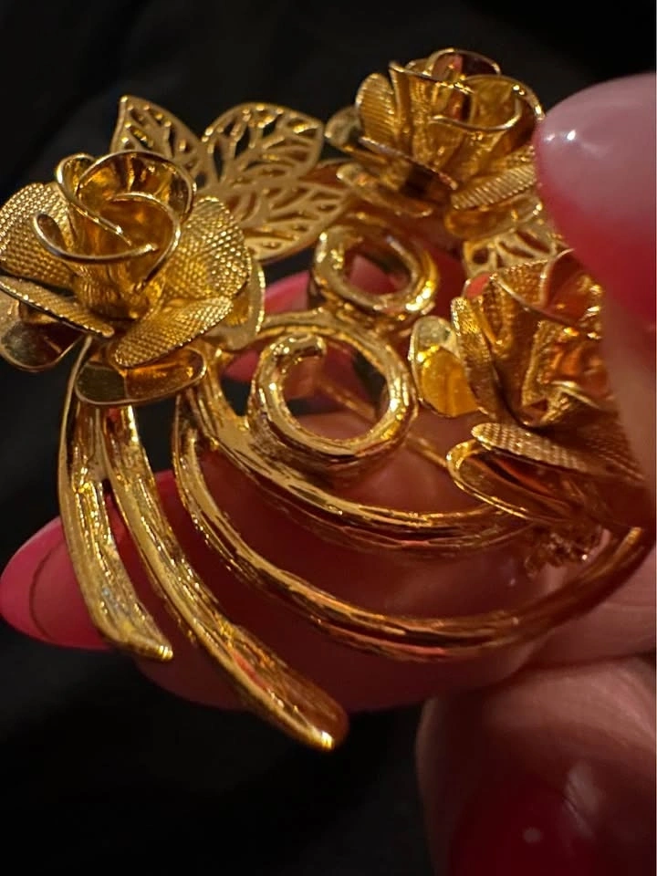 It’s the perfect accessory to add a touch of vintage charm to any outfit, or a thoughtful gift for a loved one who appreciates unique jewelry. Brand: Coro. Design: Gold-tone roses with textured petals and leaves. Dimensions: Approx. 1.75 inches in diameter (4.5 cm).