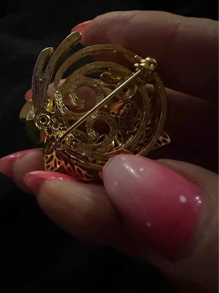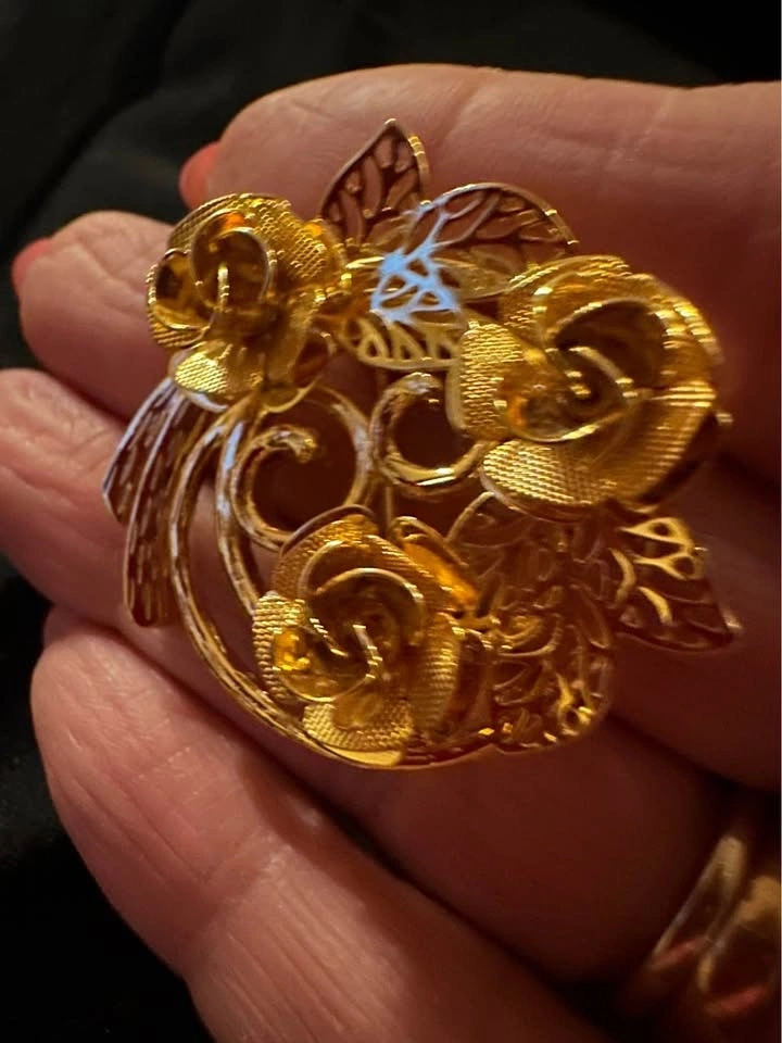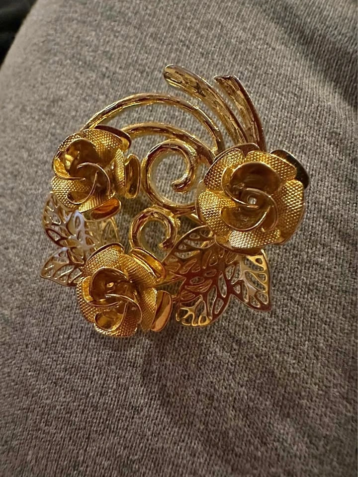 It’s the perfect accessory to add a touch of vintage charm to any outfit, or a thoughtful gift for a loved one who appreciates unique jewelry. Brand: Coro. Design: Gold-tone roses with textured petals and leaves. Dimensions: Approx. 1.75 inches in diameter (4.5 cm).