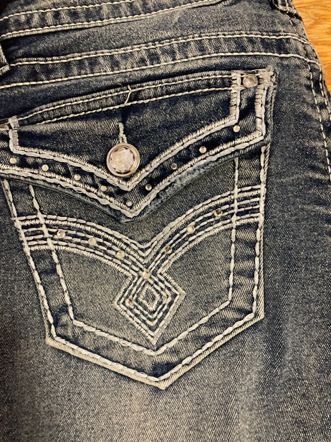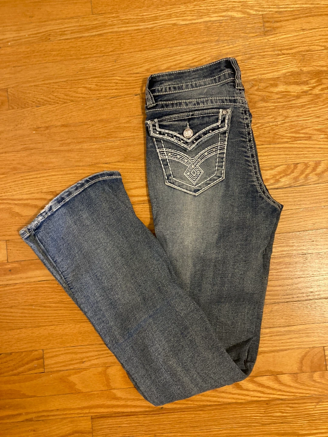 Women's Refuge/Urban Denim jeans with a bootcut/flare style y2k/vintage look. Features white contrast stitching and embellished back pockets with rhinestones. worn twice and didn’t like the size on me, looking for offers