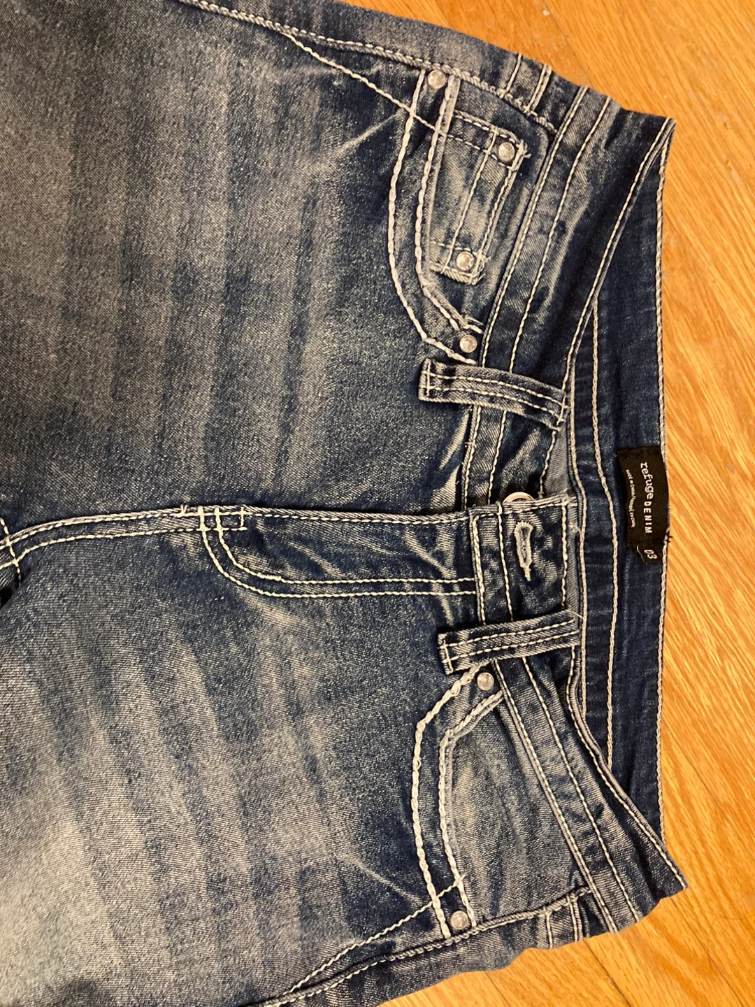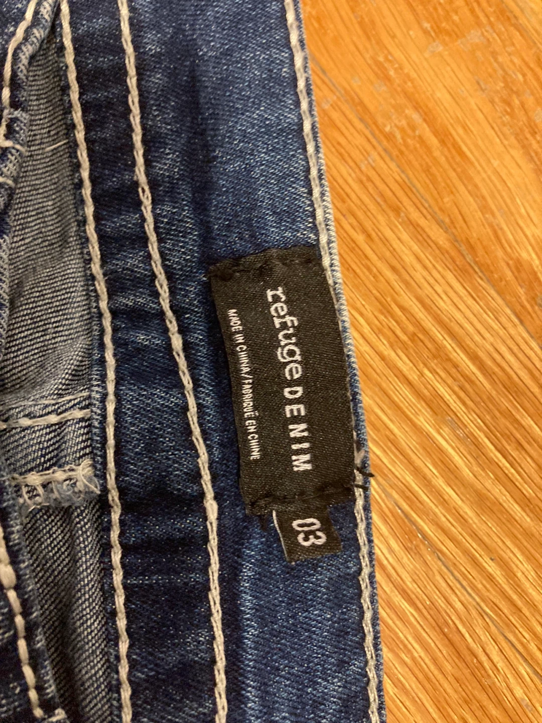 Women's Refuge/Urban Denim jeans with a bootcut/flare style y2k/vintage look. Features white contrast stitching and embellished back pockets with rhinestones. worn twice and didn’t like the size on me, looking for offers