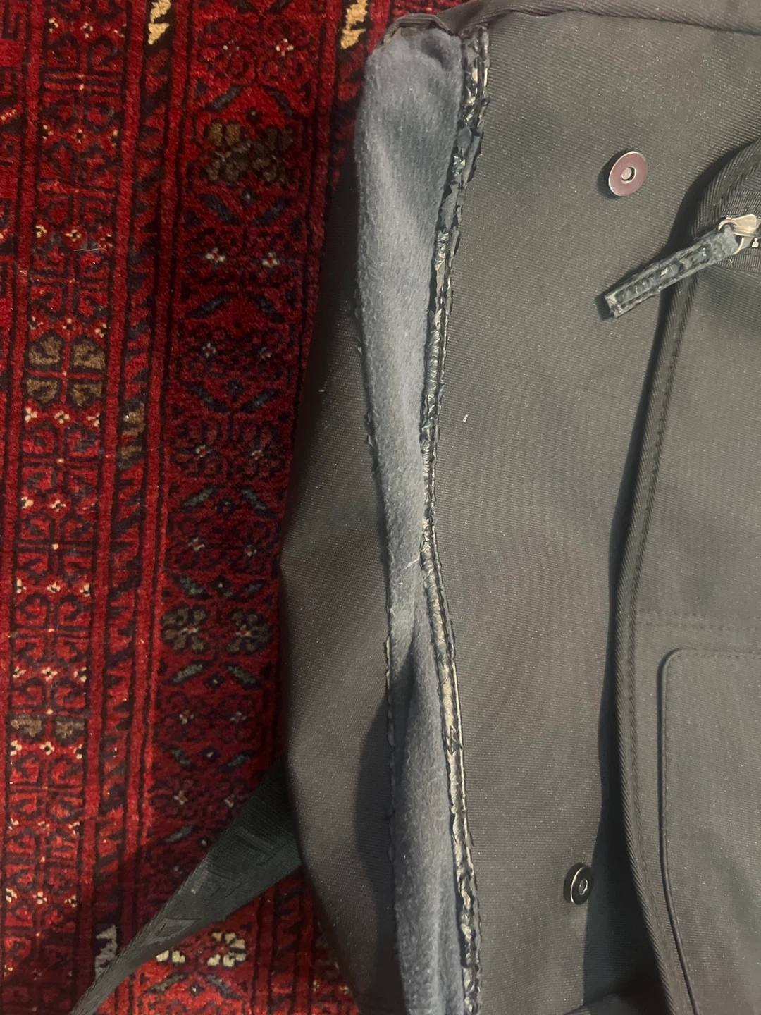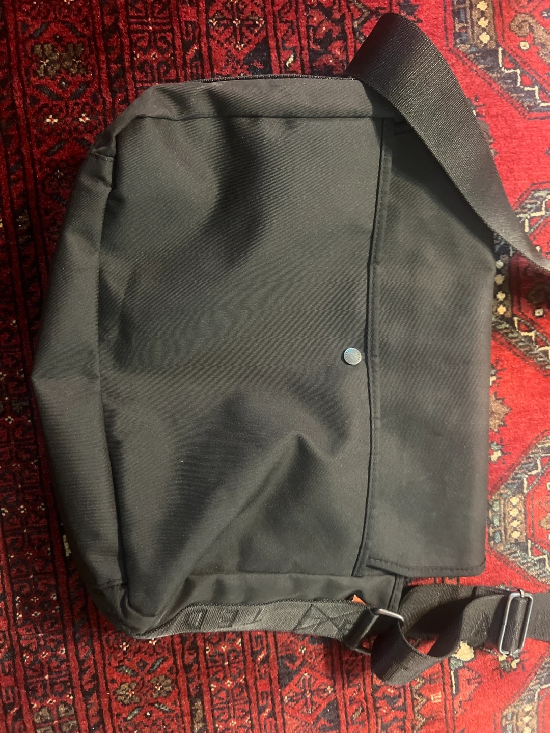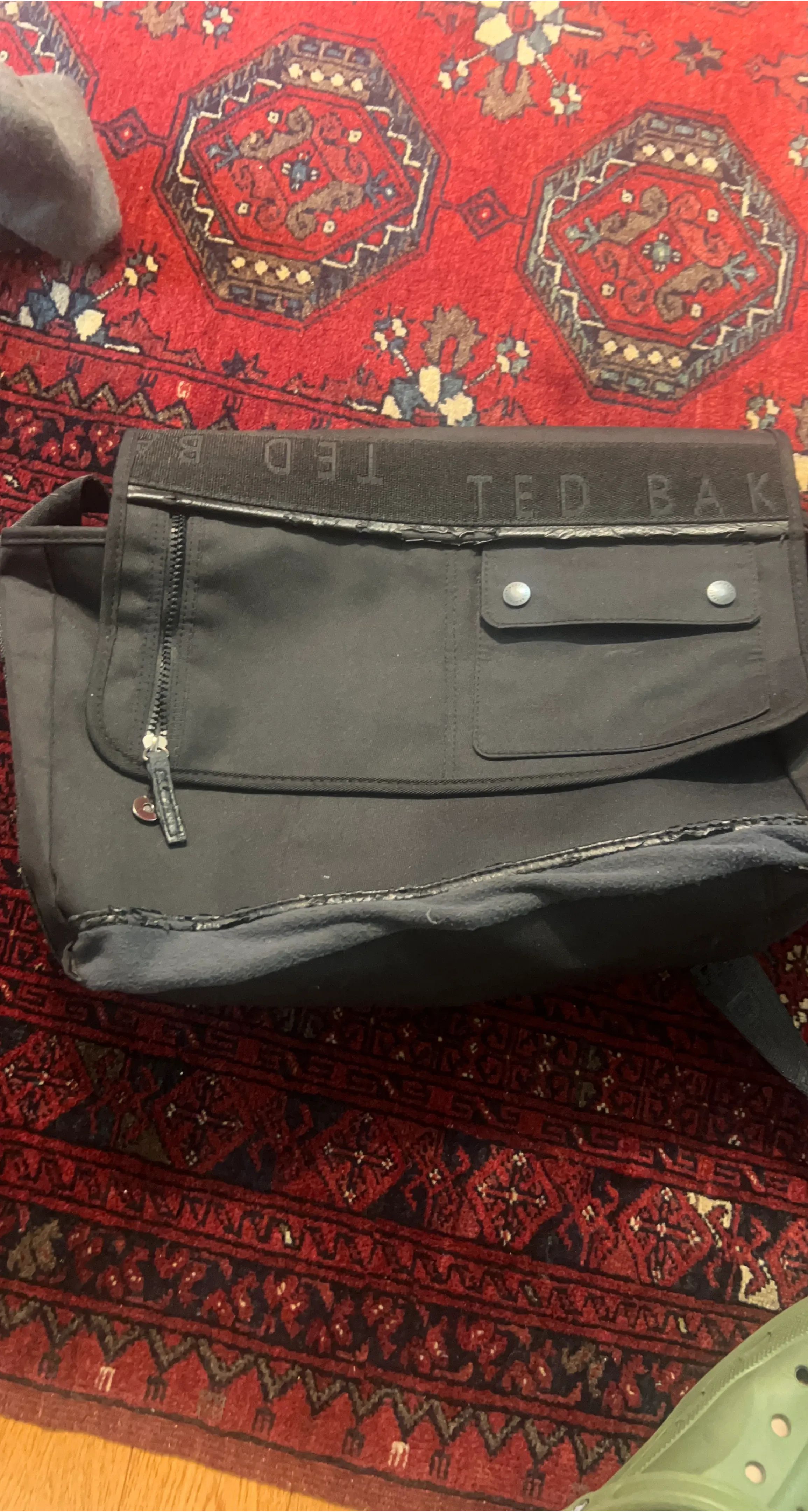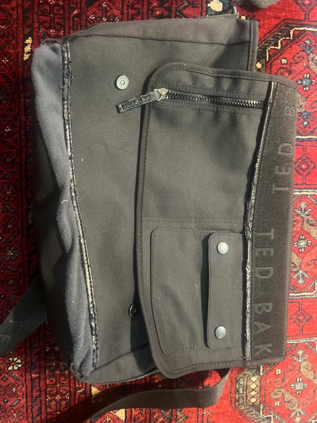 This is a black messenger bag by Ted Baker. It has a flap closure with magnetic snaps and an adjustable shoulder strap. Multiple exterior pockets for easy access.