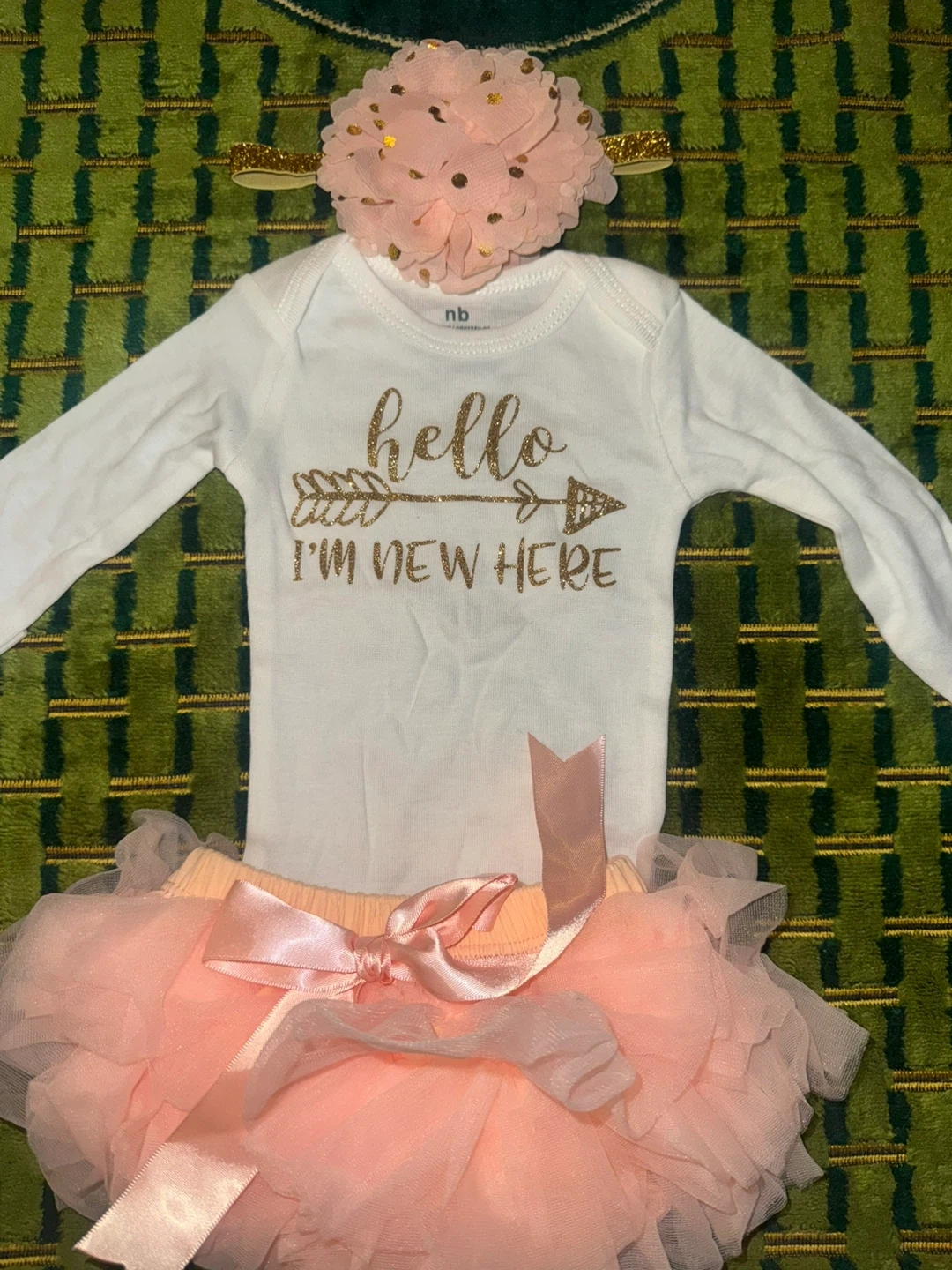 This newborn baby girl outfit includes a onesie, tutu, and headband. The onesie has "hello I'M NEW HERE" written in gold glitter. The tutu is a soft peach colour with a satin ribbon bow.