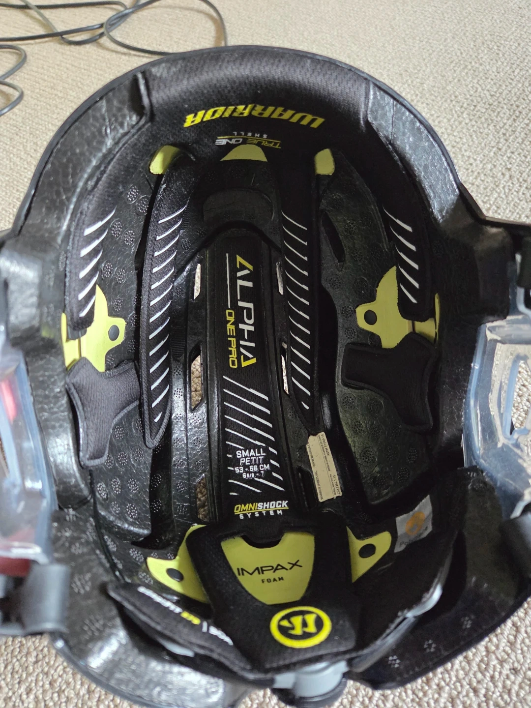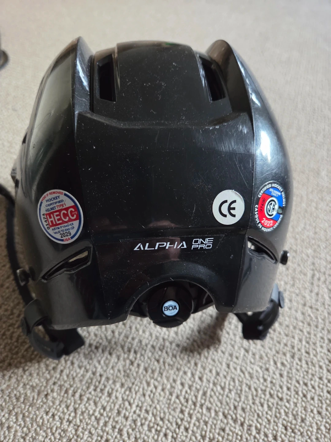 Warrior Alpha One Pro hockey helmet in black. This helmet features the BOA fit system and Omnishock system with Impax foam. Certified for hockey and meets ASTM F1045-10 standards until 2029. Small/petits fits 53-56 cm (6 5/8 - 7).