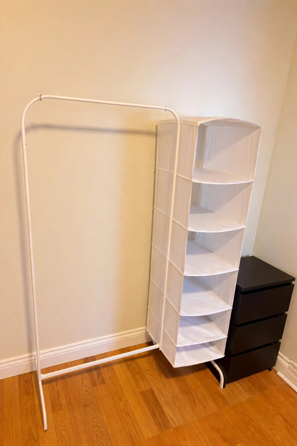 Selling a handy clothes rack and hanging shelf! Great for adding extra storage to your closet or creating a pop-up wardrobe in a small space. The rack is sturdy and the shelf is perfect for shoes, sweaters, or accessories