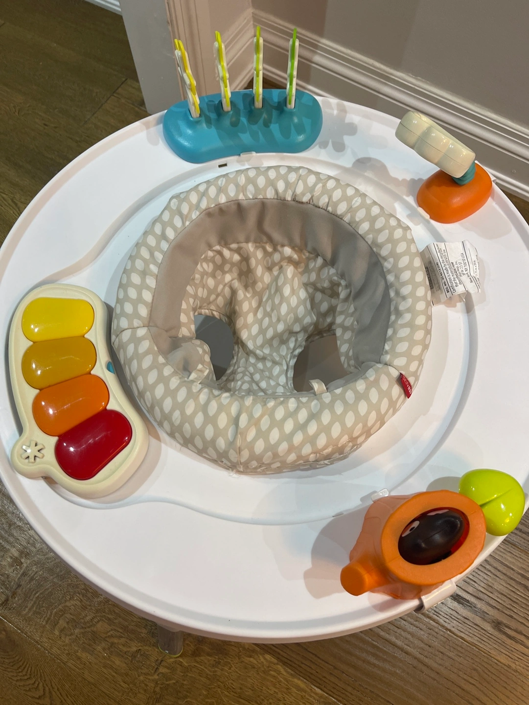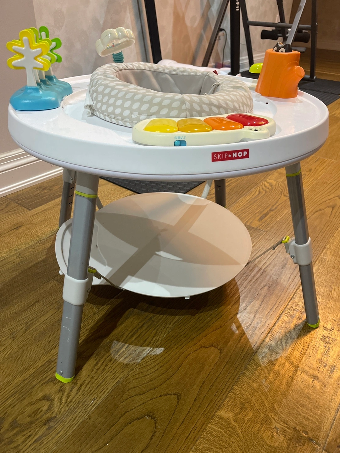 This 3-in-1 activity centre grows with your baby from a seated play centre, to a standing activity table, to a toddler table.
