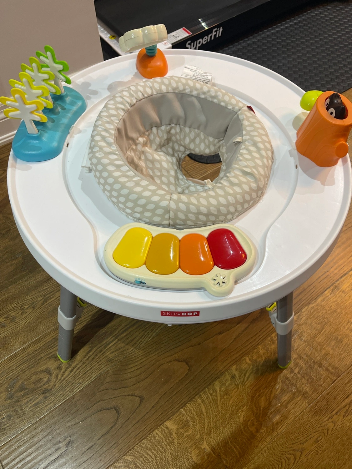 This 3-in-1 activity centre grows with your baby from a seated play centre, to a standing activity table, to a toddler table.