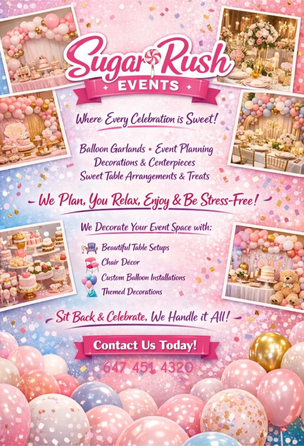 Sugar Rush Events offers comprehensive event planning, balloon garlands, and custom decorations. We handle everything from table setups to themed decor to make your celebration stress-free! Let us decorate your event space with beautiful table setups, chair decor, and custom balloon installations.