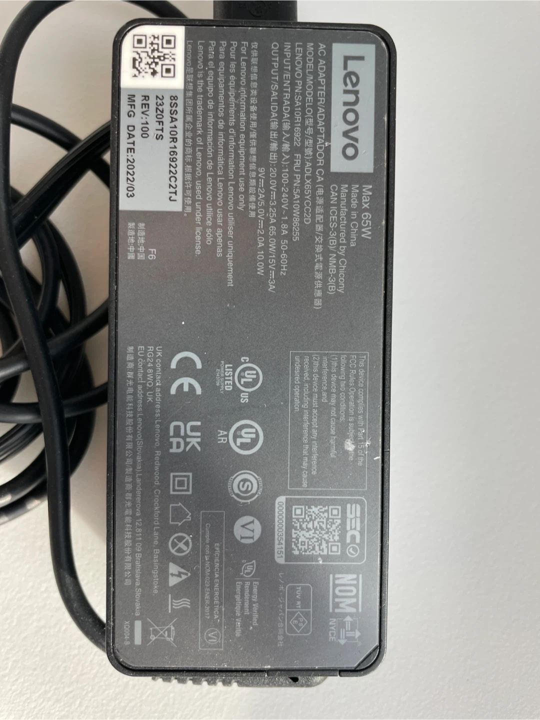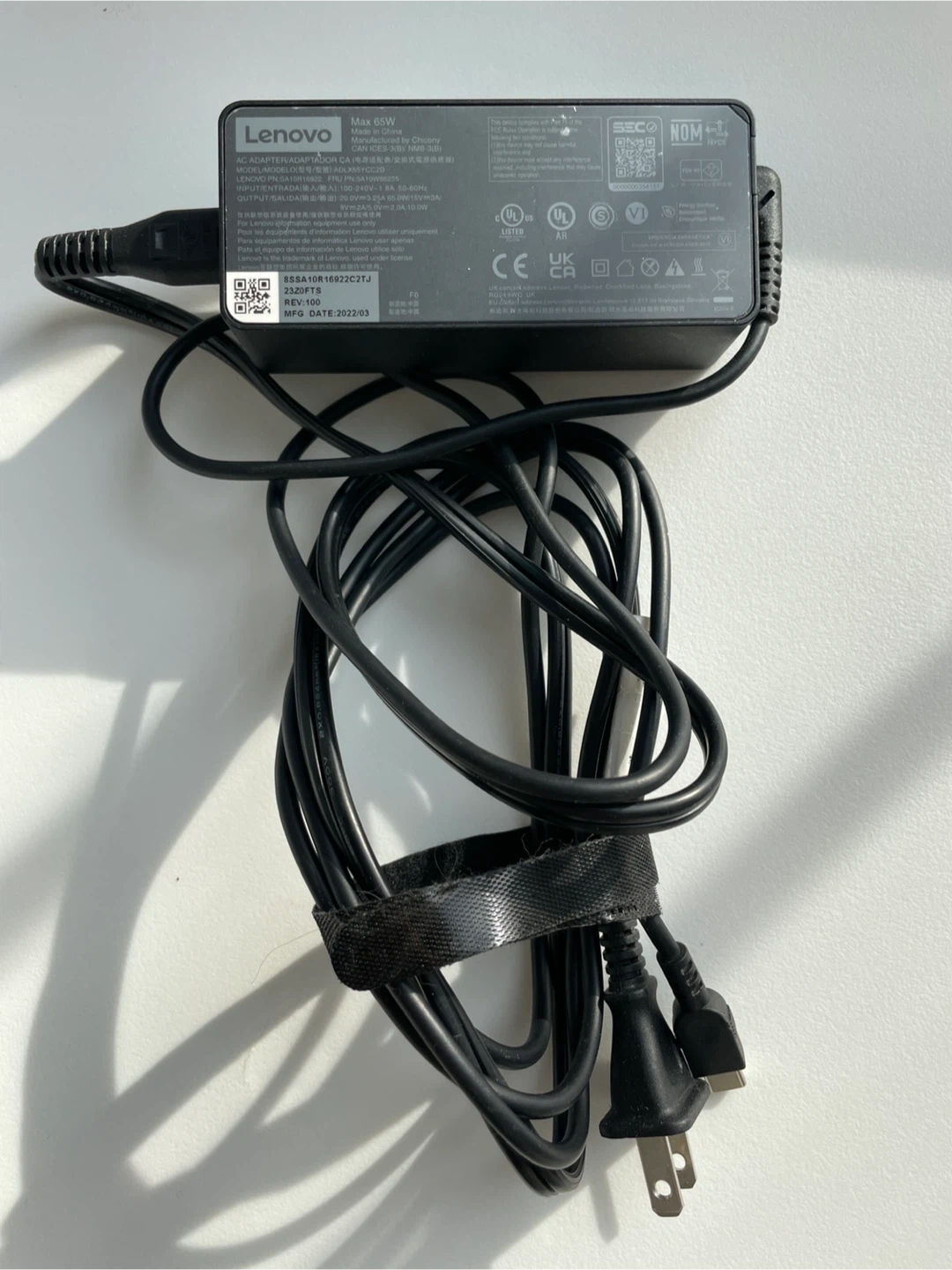 This is a Lenovo 65W AC power adapter charger. The input is 100-240V~1.8A. The output is 20V/3.25A, 65W. It comes with its original cord.