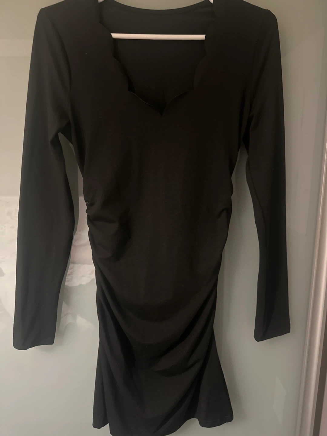 A long-sleeved black dress with ruched detailing. It features a scalloped neckline. The material is stretchy.