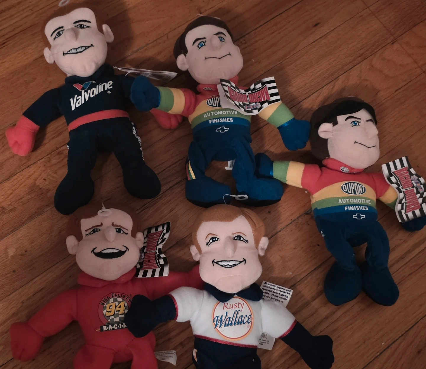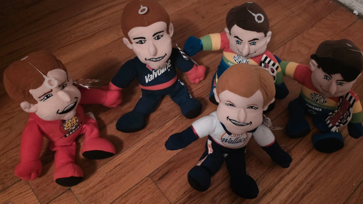 This set includes plush dolls of NASCAR drivers: Rusty Wallace, Jeff Gordon, Bill Elliott, Mark Martin, and another of Jeff Gordon. They're all soft and collectible. Great for any NASCAR fan!
