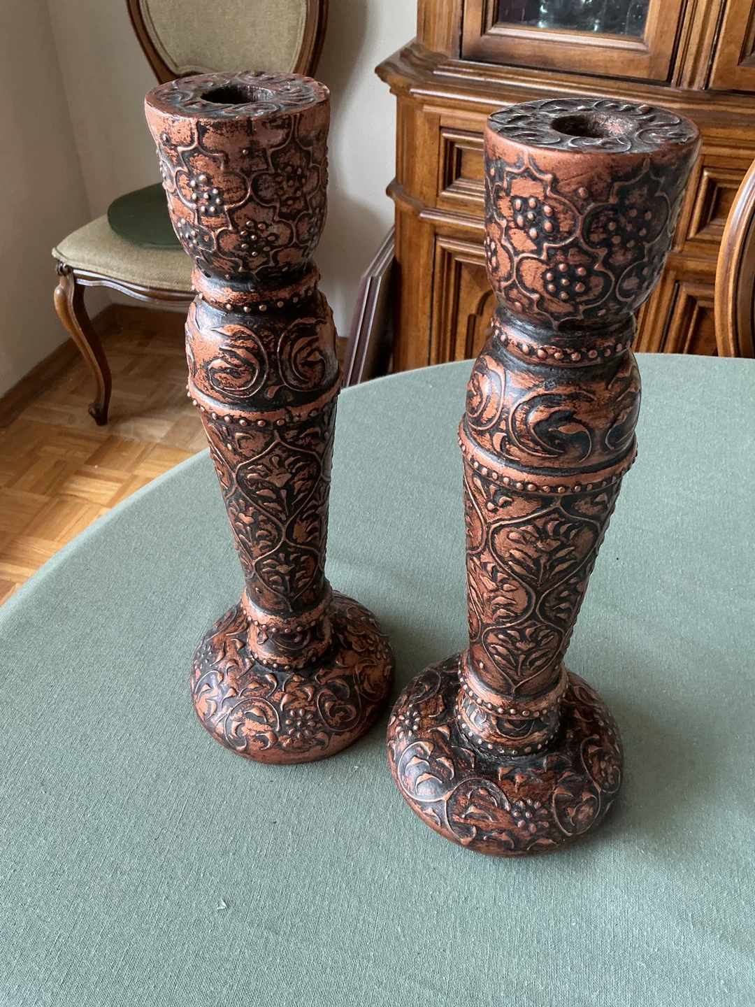 A pair of ornate candlestick holders with a detailed floral and scroll pattern. Copper and black finish. These add a touch of vintage charm to any room. Never used.