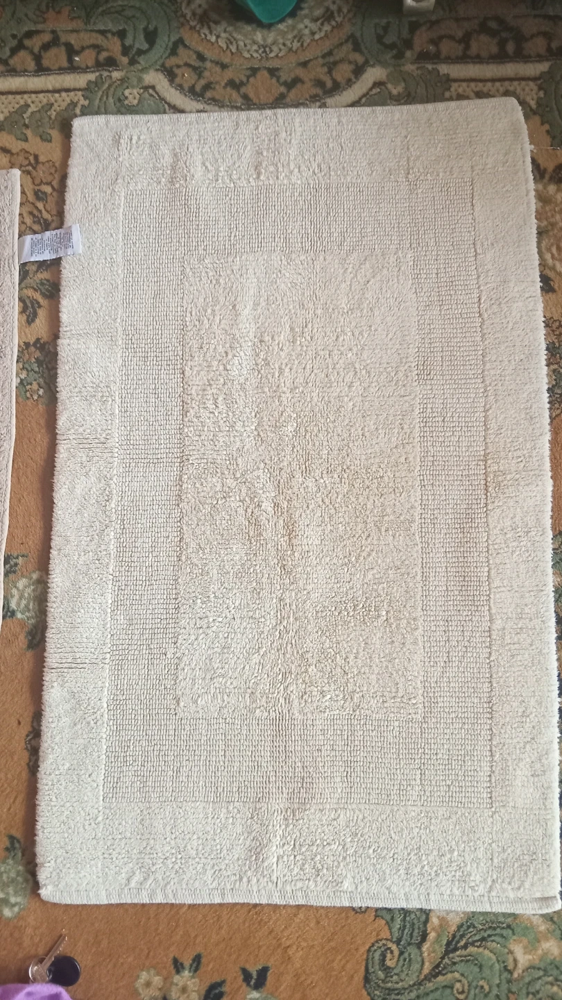 Three plush bath mats, one in white and one in beige and a darker beigh. They're soft and absorbent for your bathroom floor. These mats measure approximately .