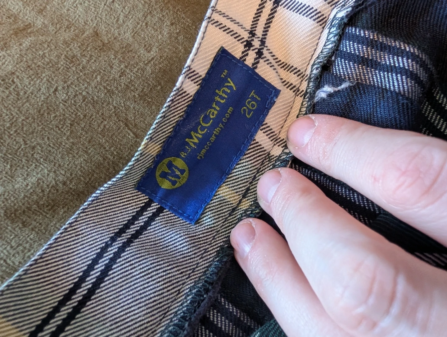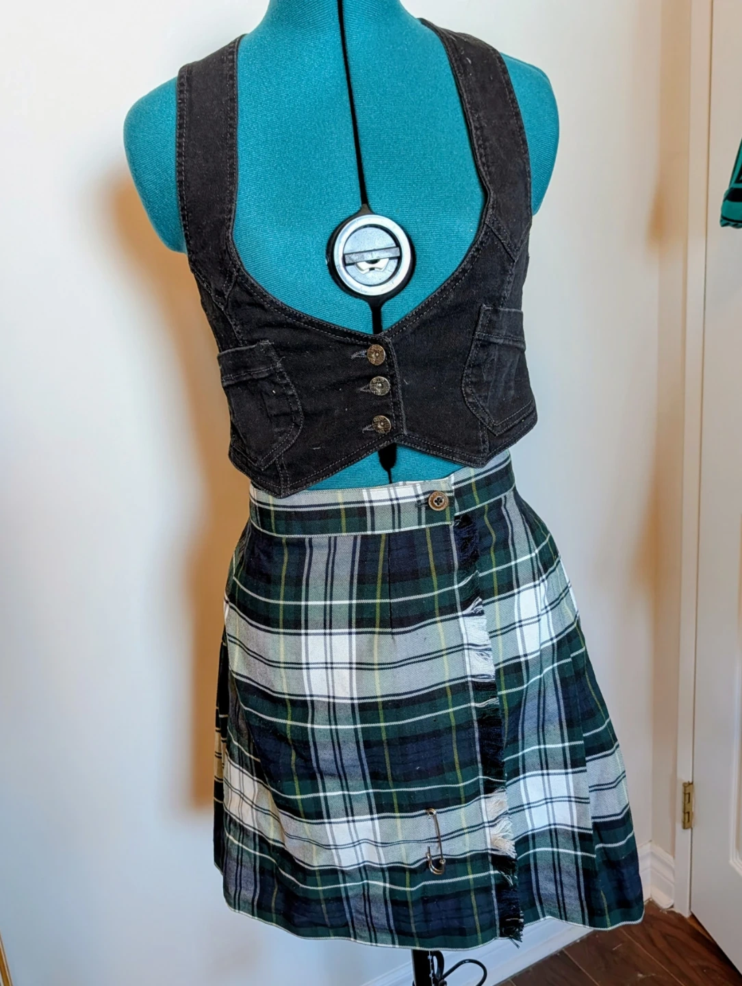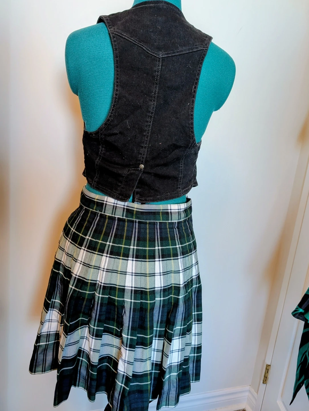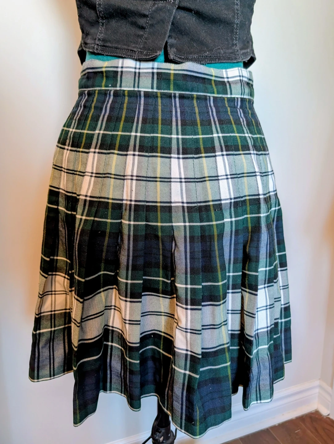 This is a cute green, white, and yellow plaid kilt It features a raw hem with some fringe detail and a button closure. The skirt has a flattering pleated design.