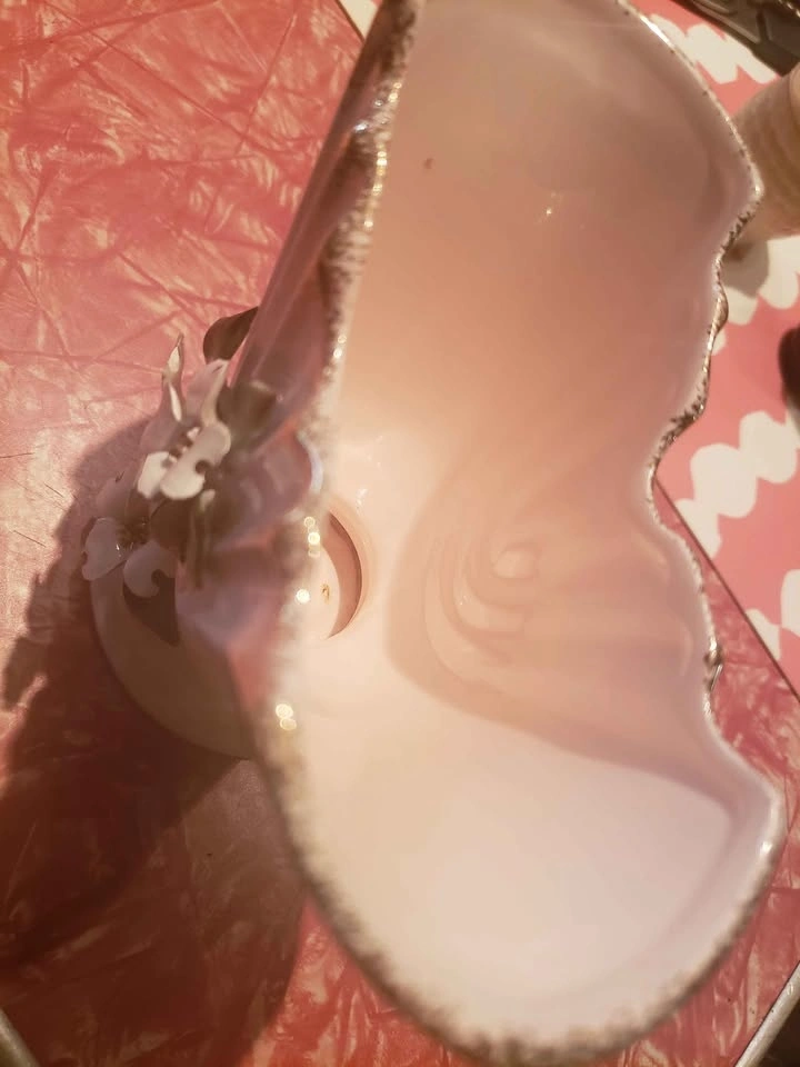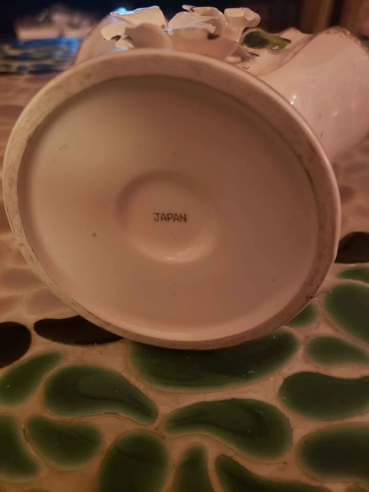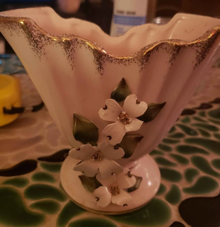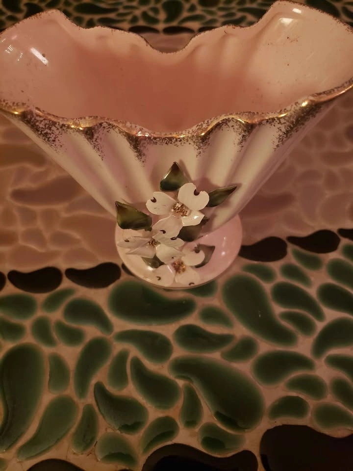 Chinoserie style porcelain vase, likely from the 1940s, made in Japan. Resembles Lefton Dogwood vases from the same era. No maker's mark. The leaves and Dogwood flowers are 3D and delicate. Some petals have small chips, but they are hard to notice. The price reflects this. Otherwise, condition is very good with no other chips or cracks. It's just under 5 inches tall and about 5.5 inches wide at the top. Features speckled gold leaf paint around the rim. A lovely vintage antique style piece in pale pink with white and gold flowers and green leaves. Pick up in Upper Lonsdale, North Vancouver.