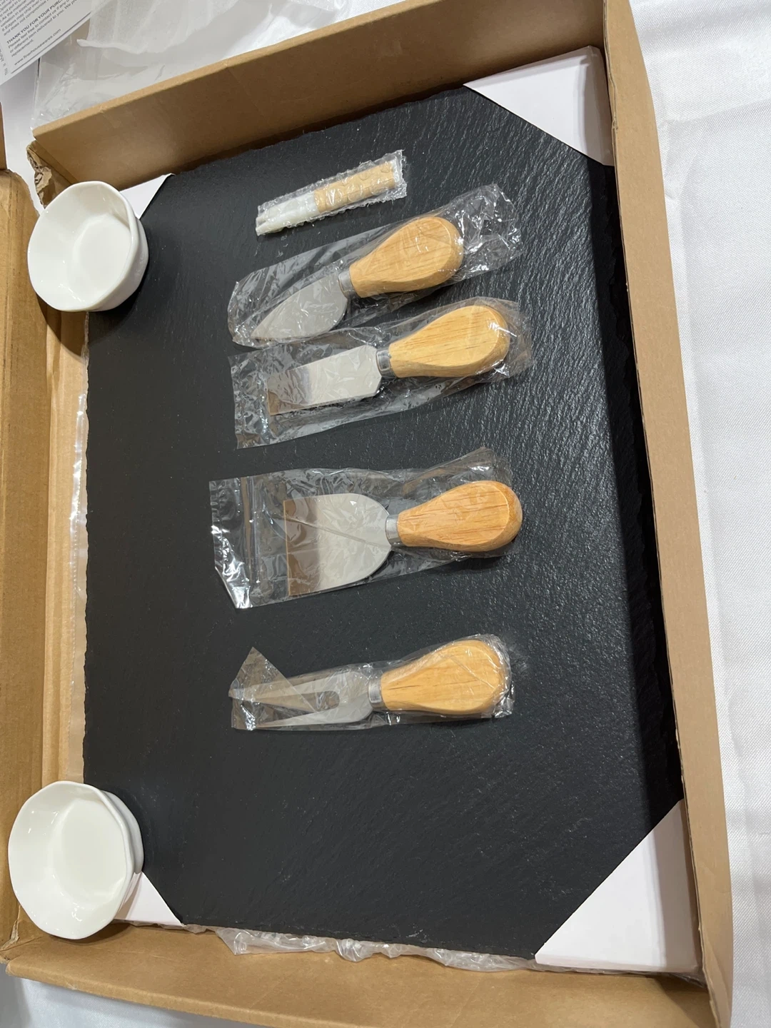 I'm selling a brand new slate cheese board set, still in its original box! It includes the slate board itself, along with a set of cheese knives and small bowls for serving. Perfect for entertaining or a thoughtful gift for the cheese lover in your life