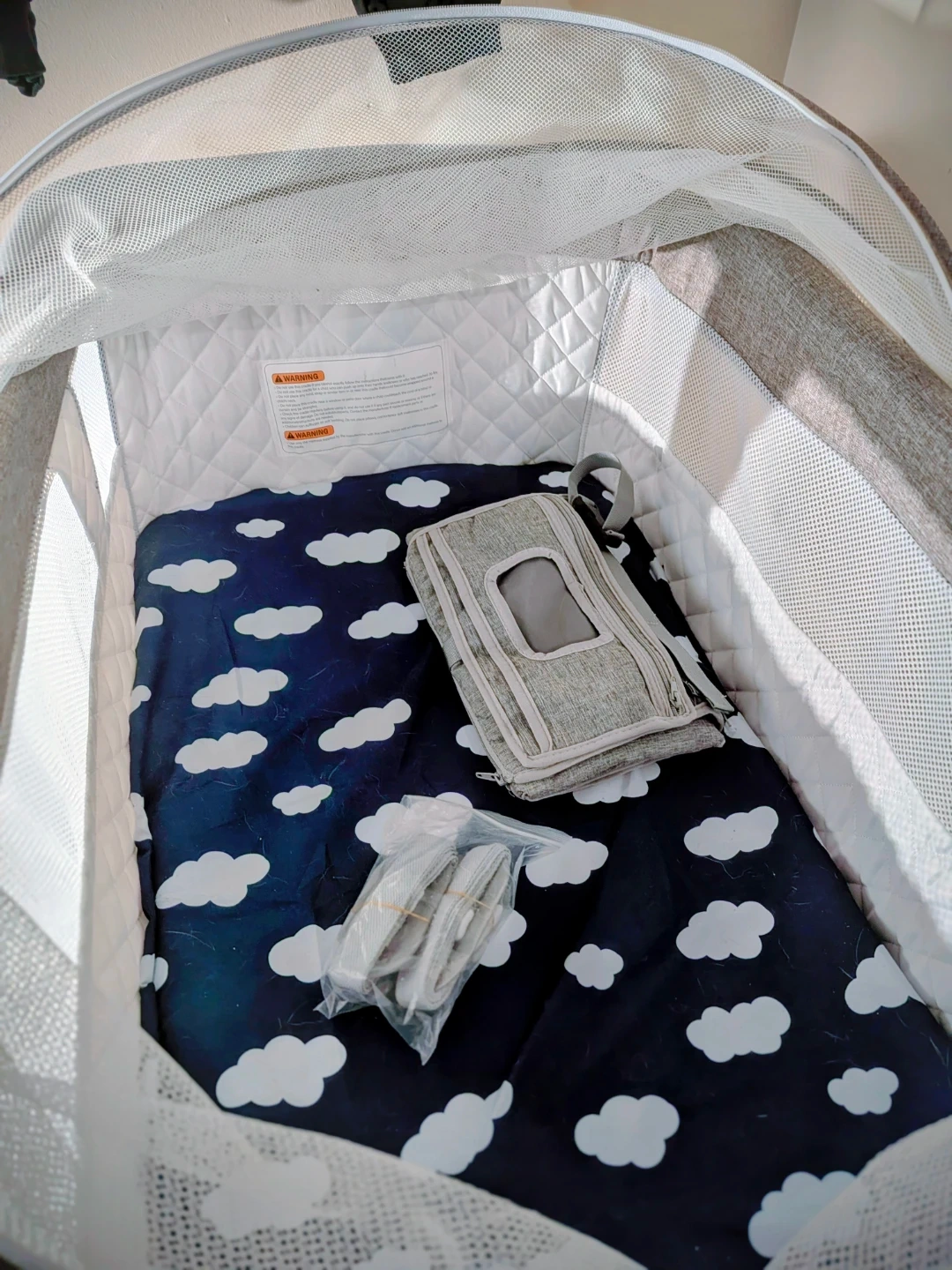 This Brand New Never Been Slept In Maddox bassinet features a mesh canopy and a cloud-print mattress. It includes straps and a carry bag. Great for travel or a small nursery!