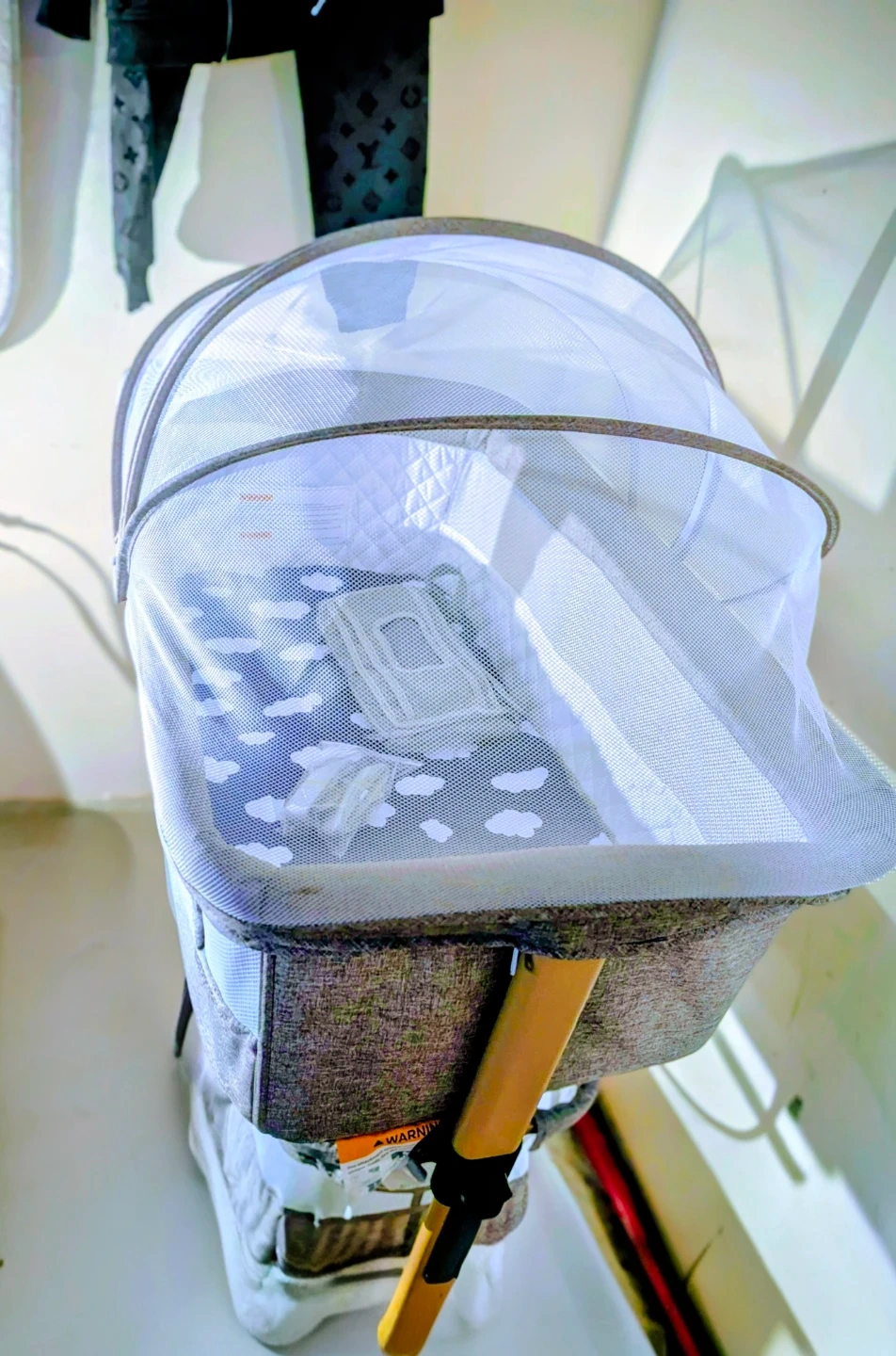 This Brand New Never Been Slept In Maddox bassinet features a mesh canopy and a cloud-print mattress. It includes straps and a carry bag. Great for travel or a small nursery!
