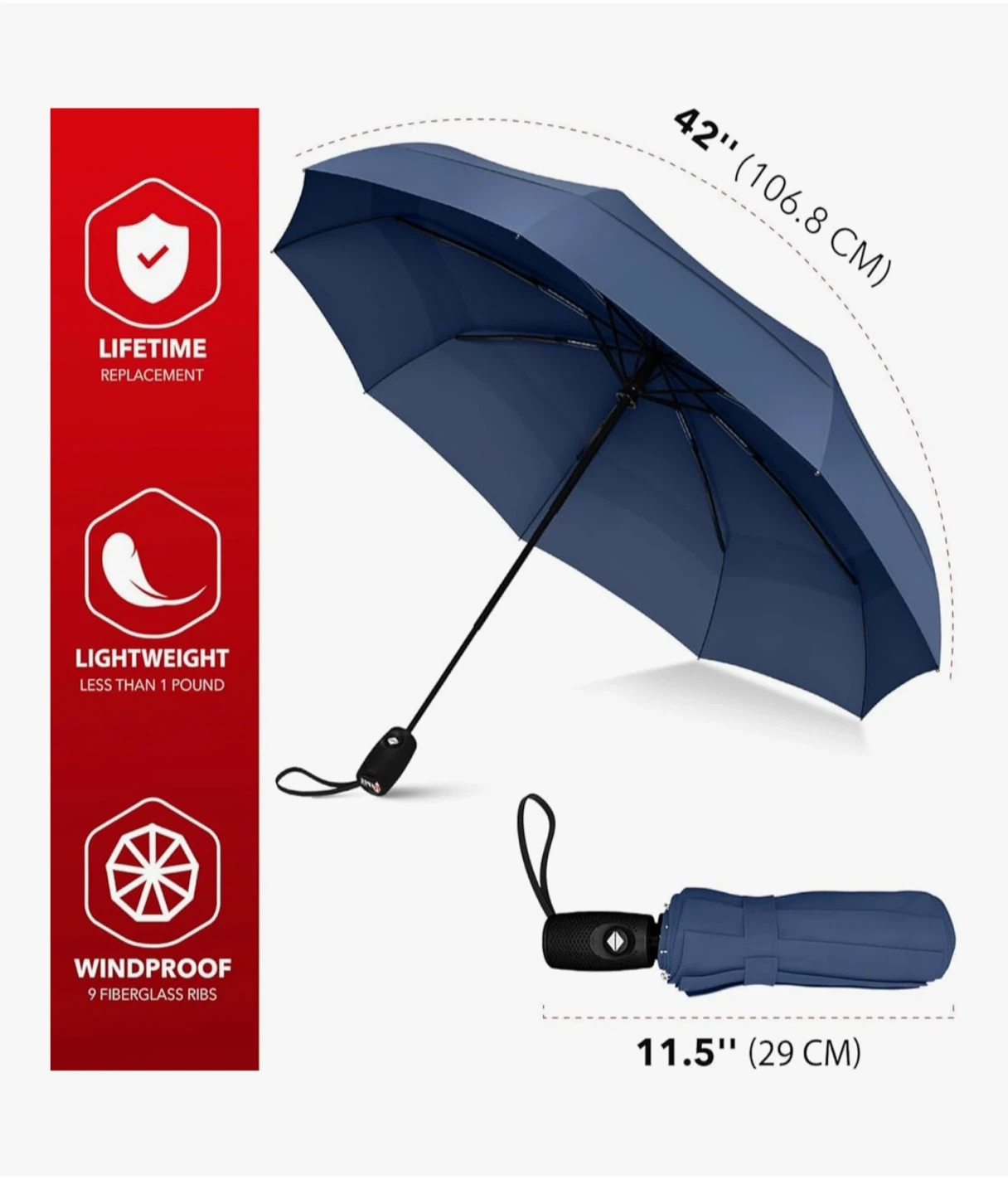 This automatic compact umbrella opens and closes with a push of a button. It's lightweight, weighing less than a pound, and features 9 fiberglass ribs for windproof performance. The fabric is treated with Teflon for superior water repellency. When closed, it measures 11.5 inches (29 cm) for easy portability.