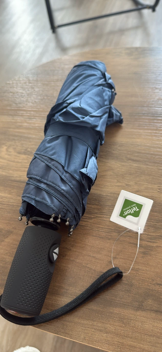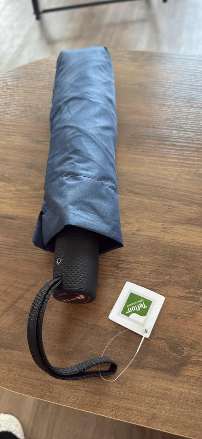 This automatic compact umbrella opens and closes with a push of a button. It's lightweight, weighing less than a pound, and features 9 fiberglass ribs for windproof performance. The fabric is treated with Teflon for superior water repellency. When closed, it measures 11.5 inches (29 cm) for easy portability.