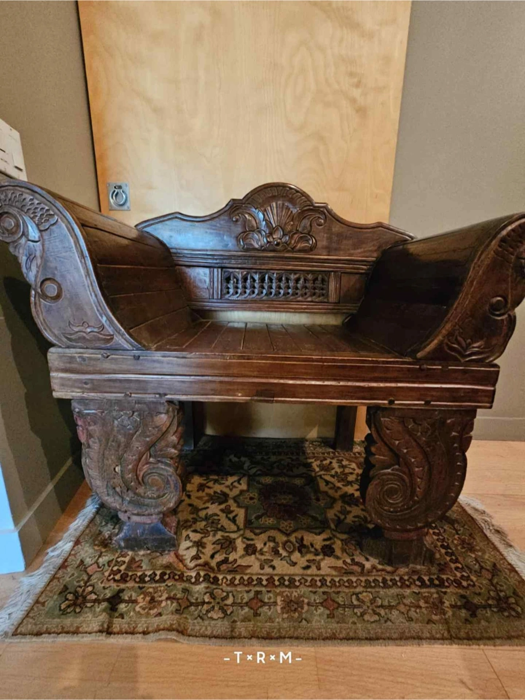 A gorgeous wooden chair with intricate carvings. This chair can be a lovely addition to any room in your home to sit and enjoy some quiet time.